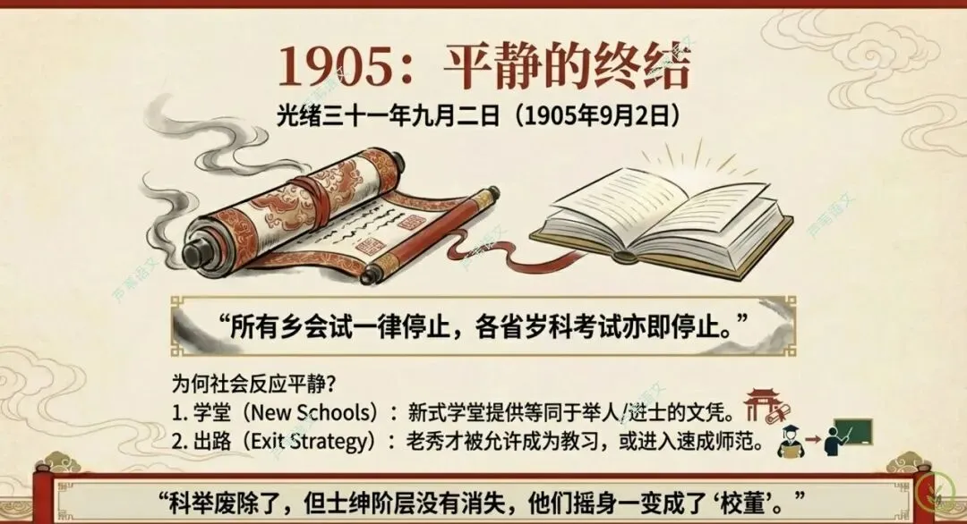 - 现实反差:废科举后,传统读书人并没有集体失业,而是迅速“换轨”。