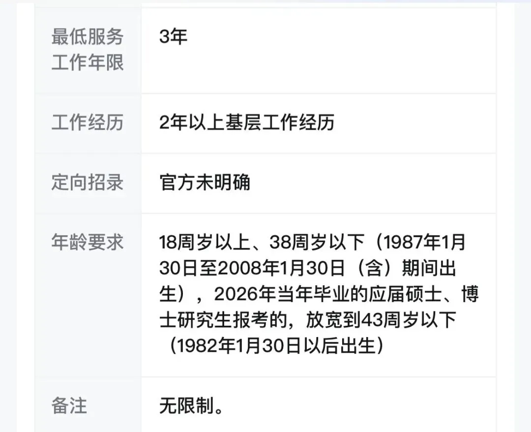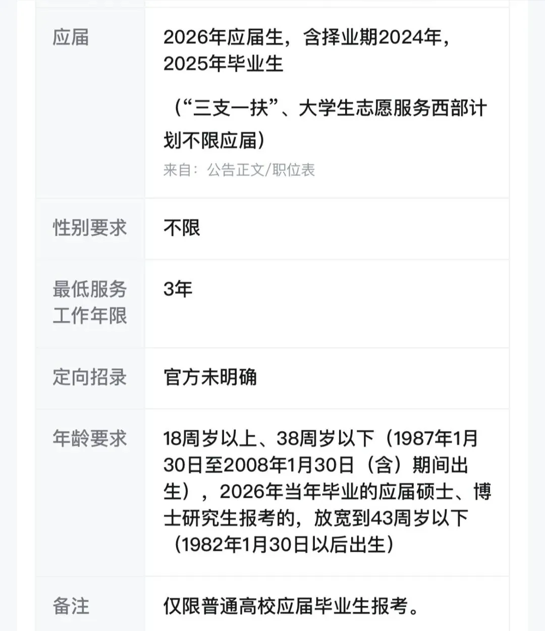 (二)18周岁以上、38周岁以下〔1987年1月30日至2008年1月30日(含)期间出生〕,2026年当年毕业的应届硕士、博士研究生报考的,放宽到43周岁以下(1982年1月30日以后出生);