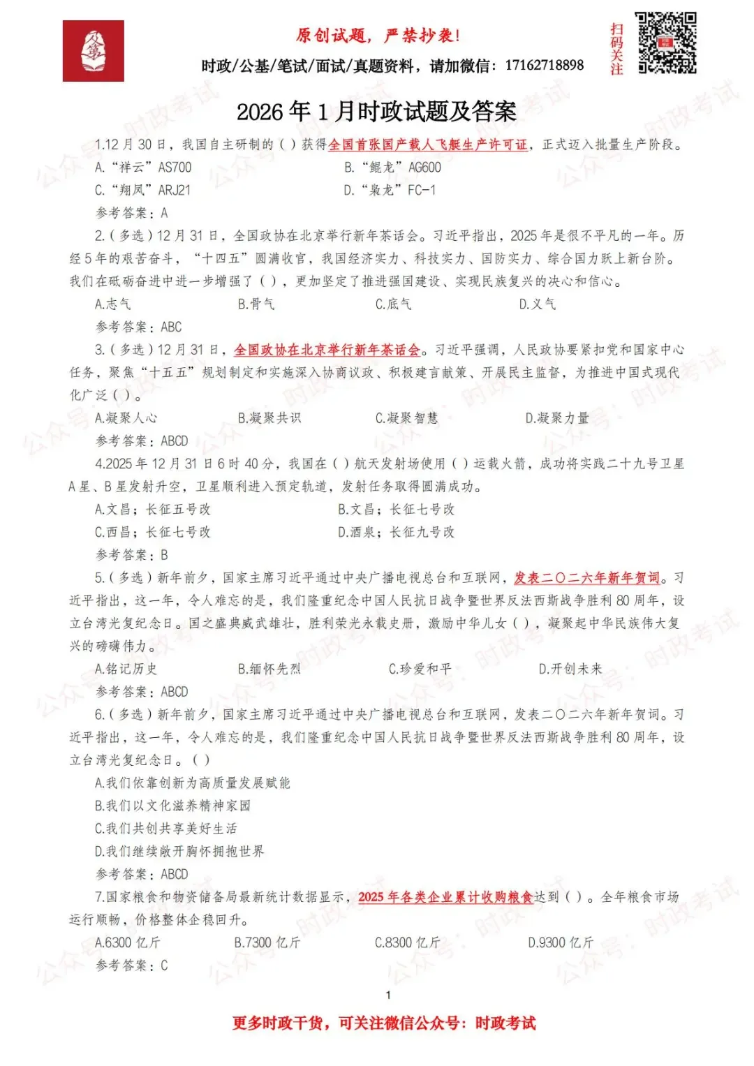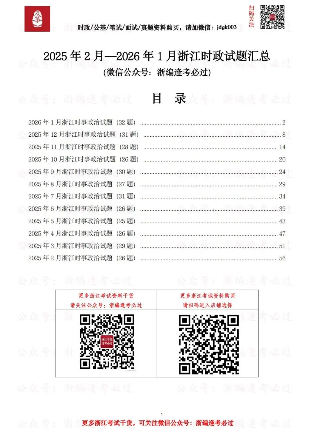 【浙江时政试题】内含2025年2月—2026年1月每月浙江时事政治试题,全部为浙江地方时政试题,共计337题,题后附参考答案,总计60页;
