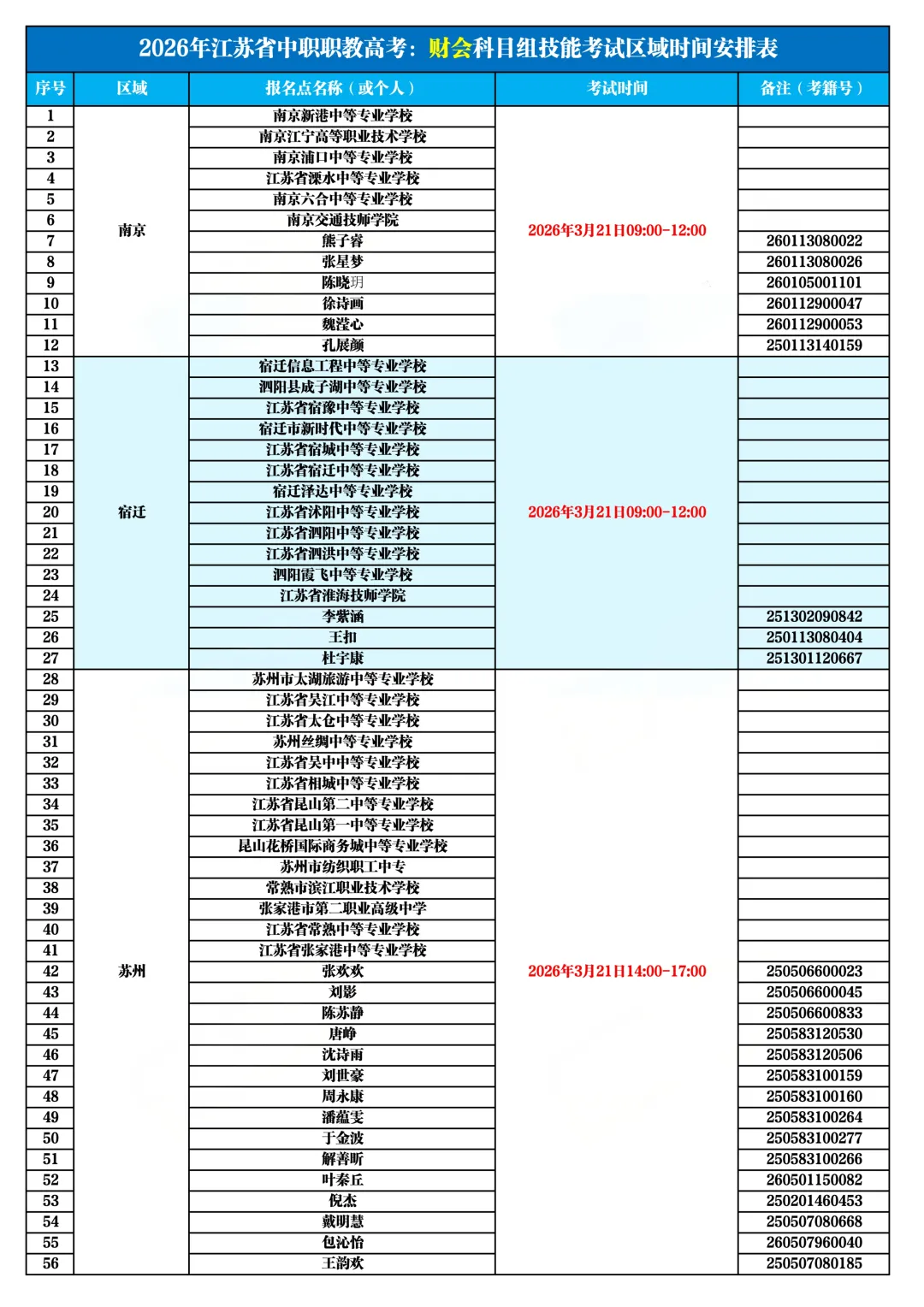 >江苏省2026年职教高考财会科目组技能考试区域时间安排表