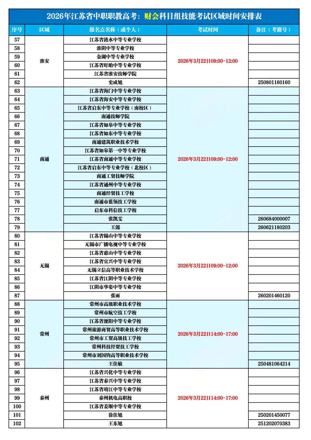 江苏省2026年职教高考财会科目组技能考试区域时间安排表