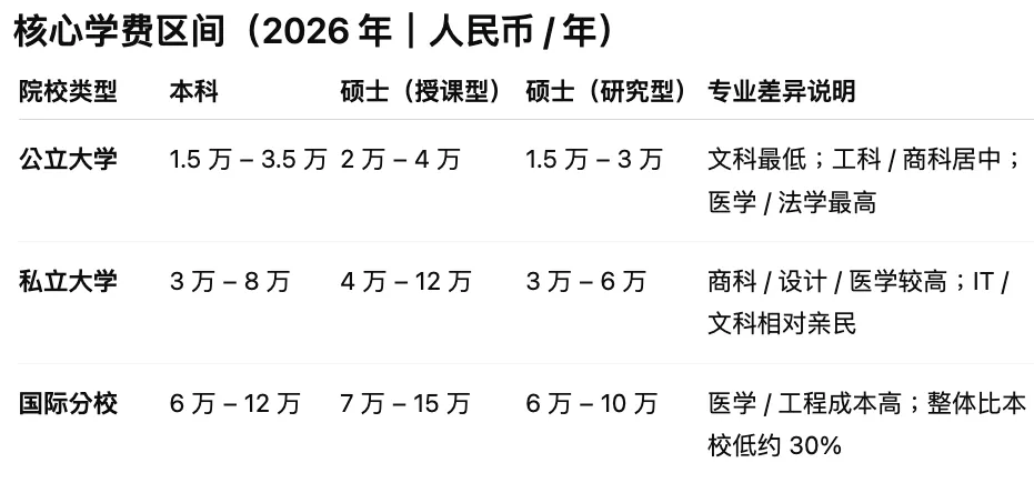 Private universities: approximately RMB 70,000–120,000 per year
