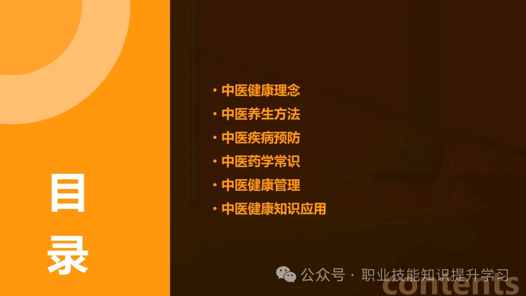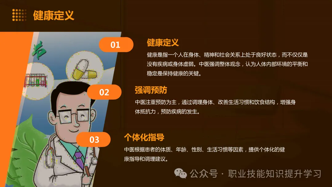 - 中医体质辨识:掌握中医体质分类(如平和质、气虚质、阳虚质、阴虚质等)的特点及判断方法,了解不同体质的养生保健重点和调理方向。