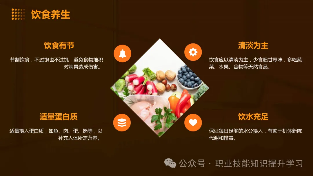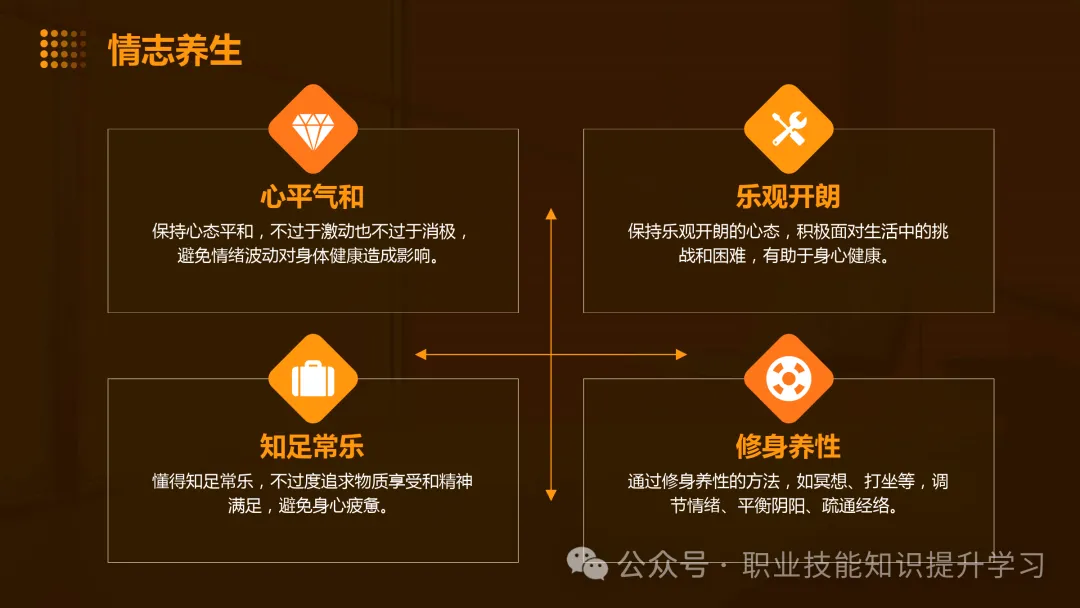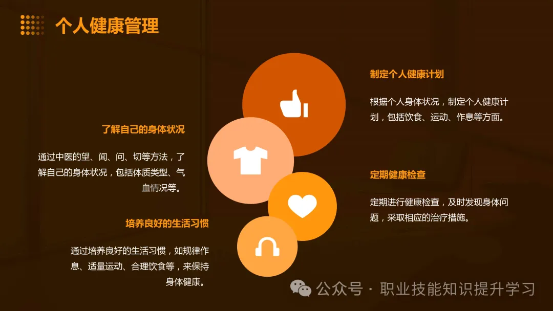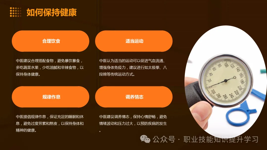 - 养生方法:学习四季养生、情志养生、饮食养生、运动养生等传统养生方法,如顺应四时起居、调节情绪、合理膳食、适度运动等,掌握不同季节、体质的养生要点。