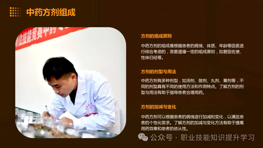- 诊断方法:掌握望、闻、问、切四诊的基本技巧,能够通过观察面色、舌象、形态,聆听声音、气味,询问症状、病史,切脉、按诊等方法,收集患者健康信息,进行初步诊断。