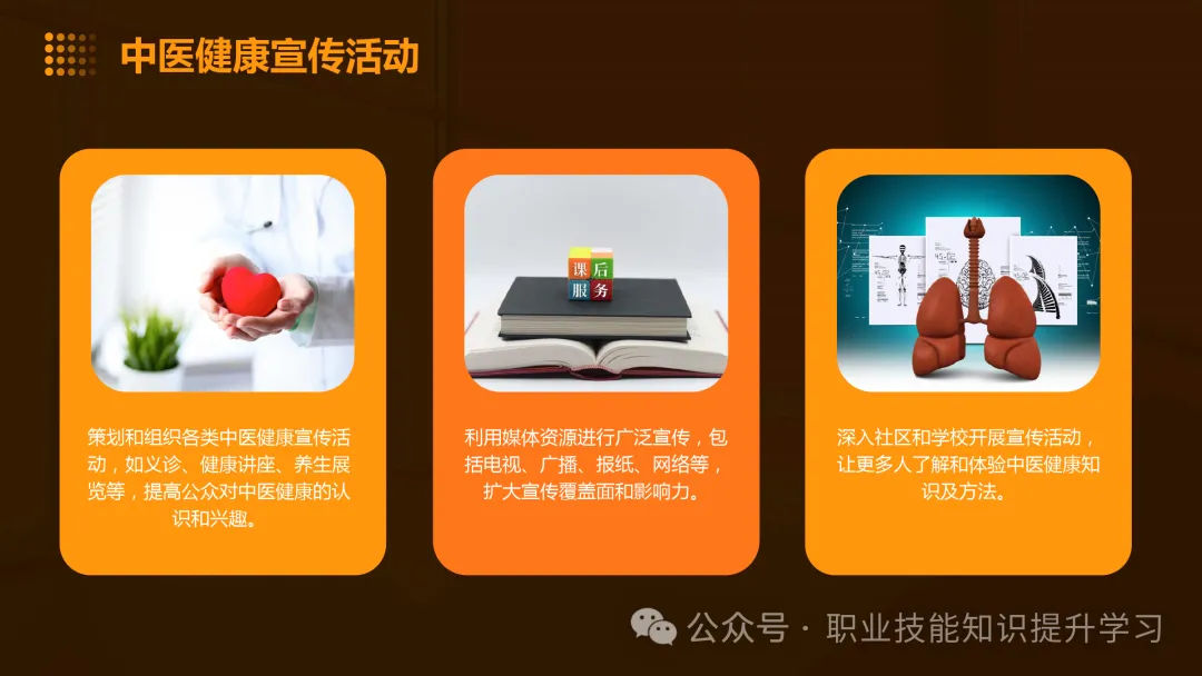 - 治疗技术:熟悉针灸、推拿、拔罐、刮痧、艾灸等中医外治法的操作原理、适应证、禁忌证及操作规范,掌握常见病症的针灸配穴、推拿手法、拔罐与刮痧的部位及力度等。