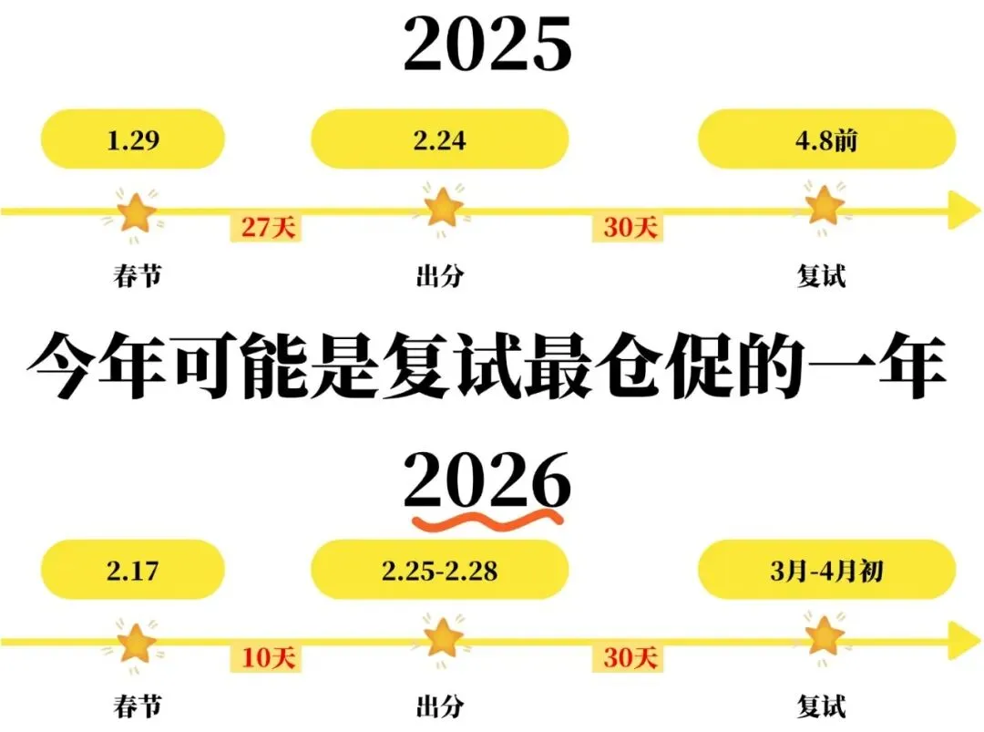 - 26考研:2.17春节→2.25左右出分→3月底至4月初马上复试,全周期直接砍到40天!春节后10天左右分数就公布了!