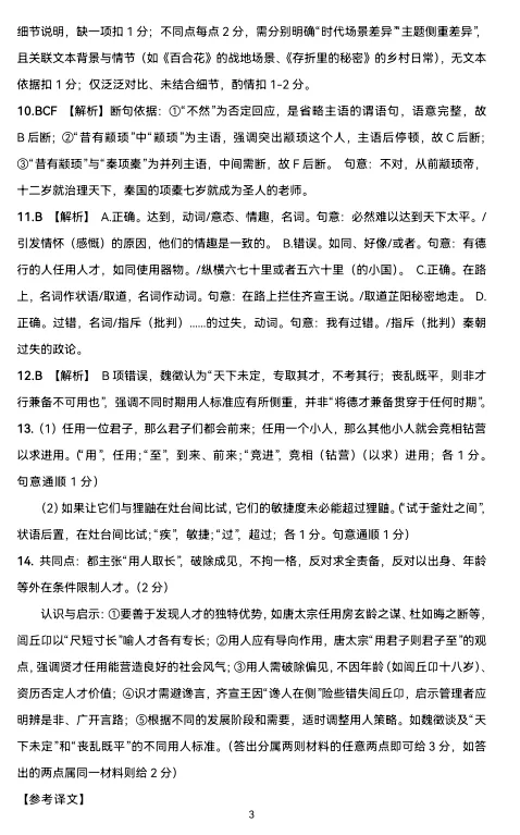 10。材料一画波浪线的部分有三处需要断句,请用铅笔将答题卡上相应位置的答案标号涂黑,每涂对一处给1分,涂黑超过三处不给分。(3分)