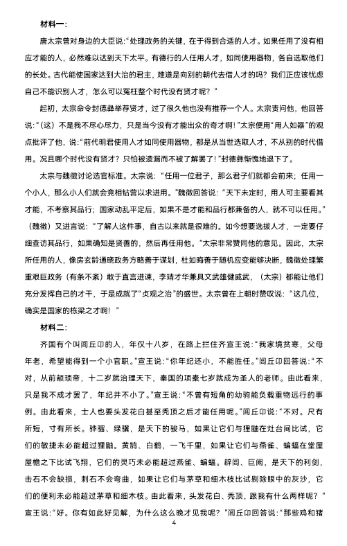 14、材料一中的唐太宗和材料二中的闾丘卬都阐述了鲜明的人才观,二者的共同点是什么?请结合材料谈谈你的认识与启示。(5分)