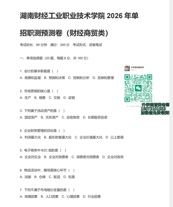 以下是湖南财经工业的押题试卷!需要的同学可以找黄老师领取!