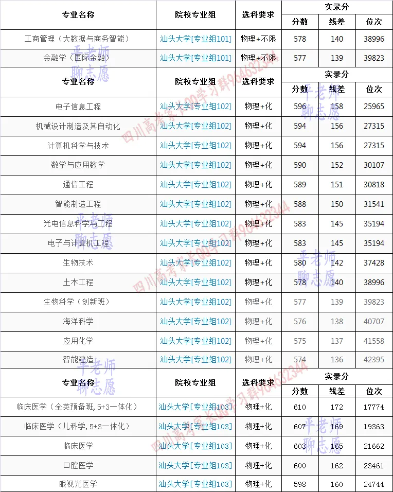 2025年四川专业录取情况:汕头大学历史类报考热度法学、国际经济与贸易、工商管理等专业;物理类报考热度集中在临床医学、口腔医学等医学类专业以及电子信息工程、机械设计制造及其自动化、计算机科学与技术等热门工科专业,详细录取情况如图。