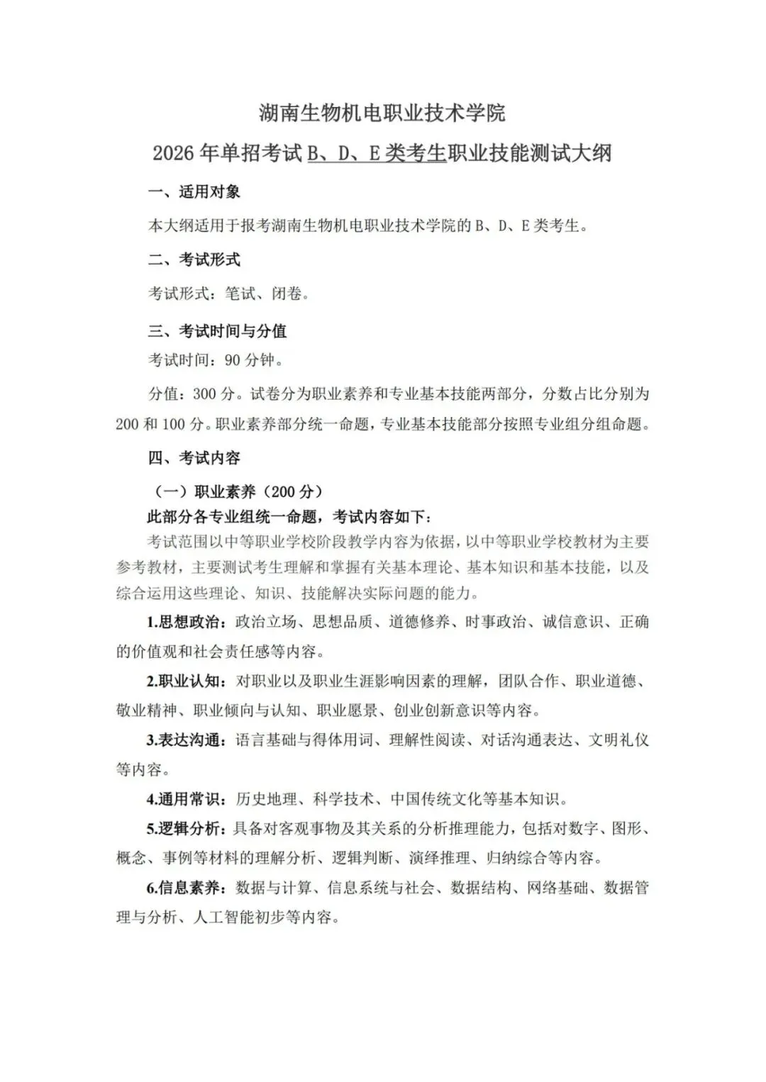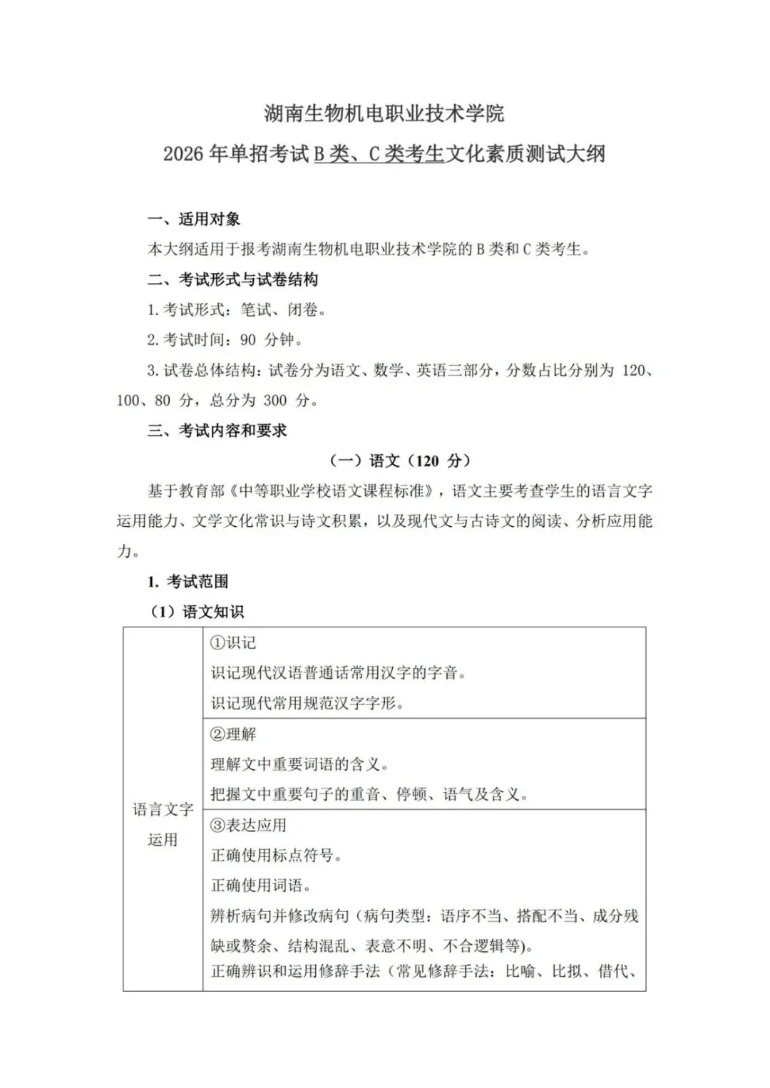 【考试大纲】2026湖南生物机电职业技术学院单招考试大纲