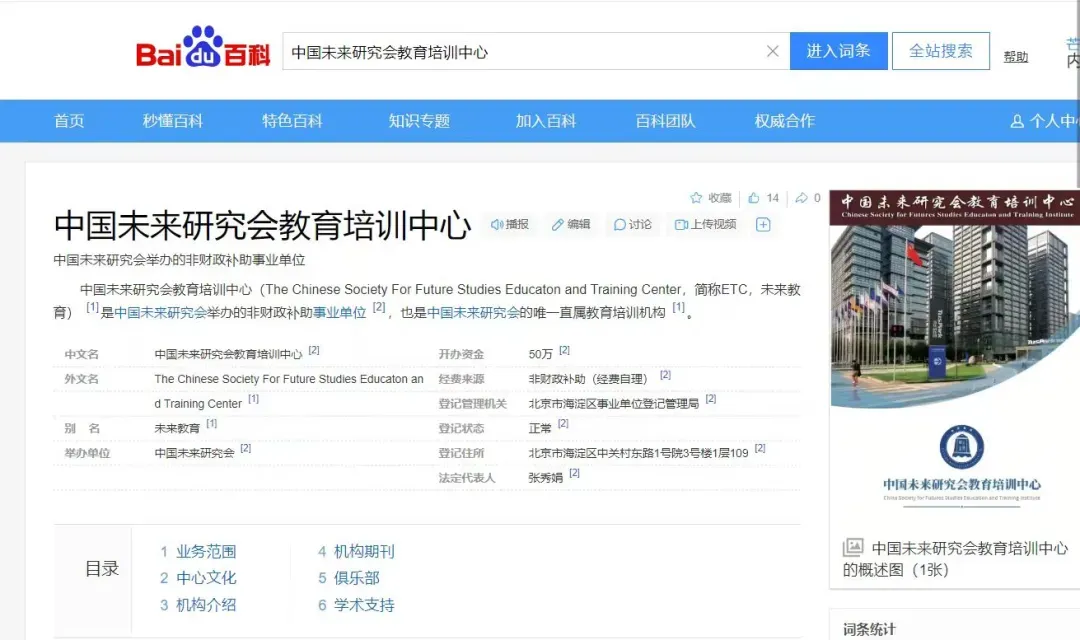 中国未来研究会教育培训中心(The Chinese Society For Future Studies Educaton and Training Center,简称ETC,未来教育)是中国未来研究会的唯一直属教育培训机构,经北京事业单位编办记属事业单位性质,其上级主管单位为北京市海淀区教委。未来教育是由政、学、研三方共同监督主办的教育培训机构,拥有科学超前的课程研发理念和综合权威的教育培训资源。