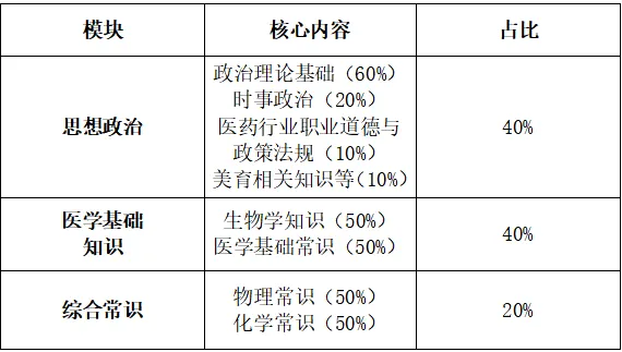 职业技能测试包括思想政治、医学基础知识和综合常识三个模块。注重考查考生政治理论基础、职业适应必备知识和关键能力、综合素质和学科素养以及分析问题和解决问题的能力。具体内容如下: