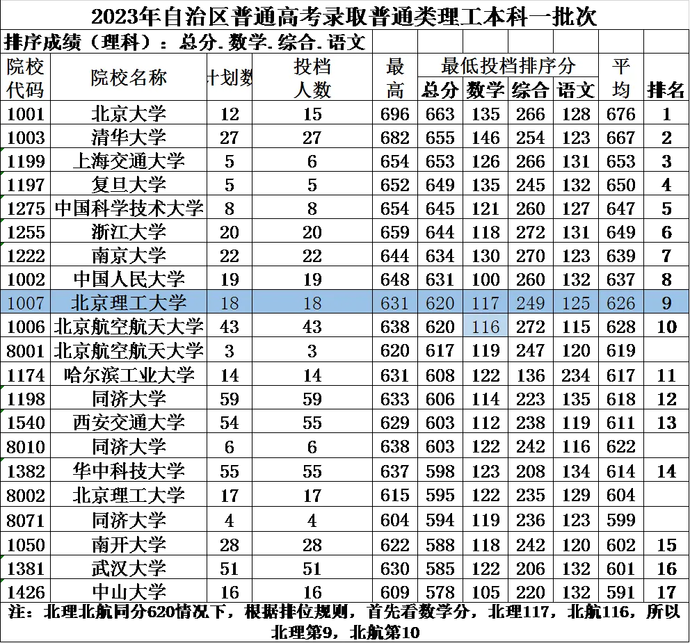 根据新疆考试院的统计:2023年北理(1007)在新疆的录取分数与兄弟高校北航(1006)同分,实际录取位次还超过了北航(参上表),坦率讲,这出乎包括我们在内的一些家长的预料,长期以来,在招生录取排名上,北理落后于北航,显然这不是两所高校实力的真实反映,实际上两所高校各有所长,北航以航空航天方面的研究举世闻名,北理长期以兵器方面的研究全国领先,“北航是研究怎么把人送到天上去,北理是研究怎么把天上的东西打到地面上”,民间这一评价多少反映了两所高校的特色!因此,两所高校仅是研究领域的分工不同,在综合实力上相差远不象录取排名表现出的那么大,正如生活在北京的老百姓常说的那样,北理北航没区别!2020年,在教书之余我开始从事学校在新疆的招生工作,身处高校的我虽然早就知道北理北航各有优势,差别不大,但实际招生时却发现,北航无论在学校知名度,还是在高校录取排名方面都远超北理,以至于在考生中形成了北航情节及其报考的路径依赖,但现实是最好的老师!多年后,同学之间在保研、就业等多方面的实际对比,使越来越多的同学发现:北理实在是一个香饽饽!