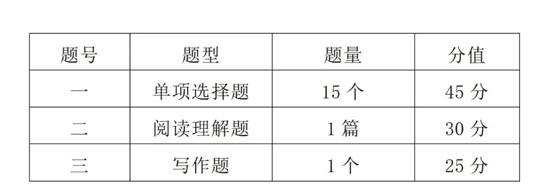 ①试卷题型:单项选择题、阅读理解题和写作题。