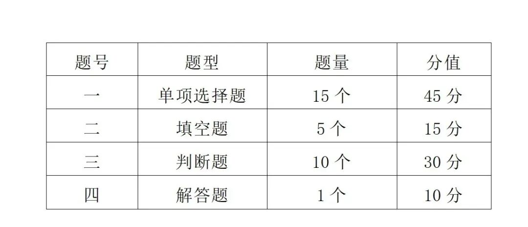 ①试卷题型:单项选择题、填空题、判断题和解答题。