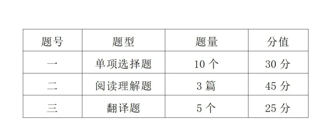 ②考核内容:考核考生的英语词汇、语法基础和英文翻译(英译中)能力。