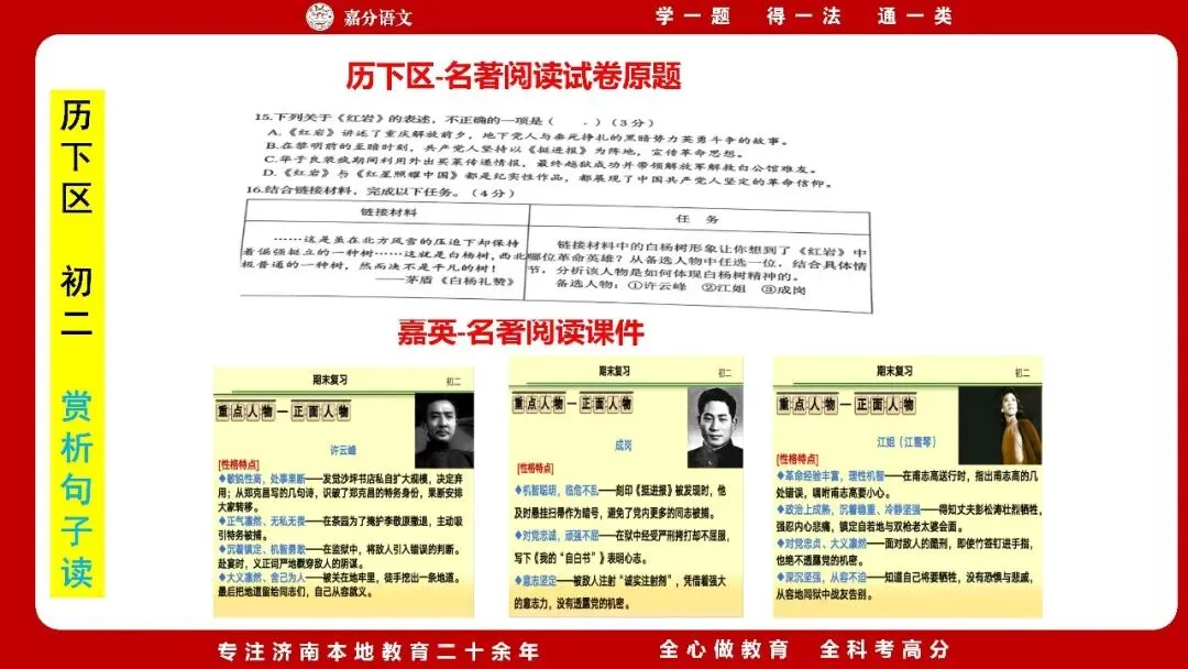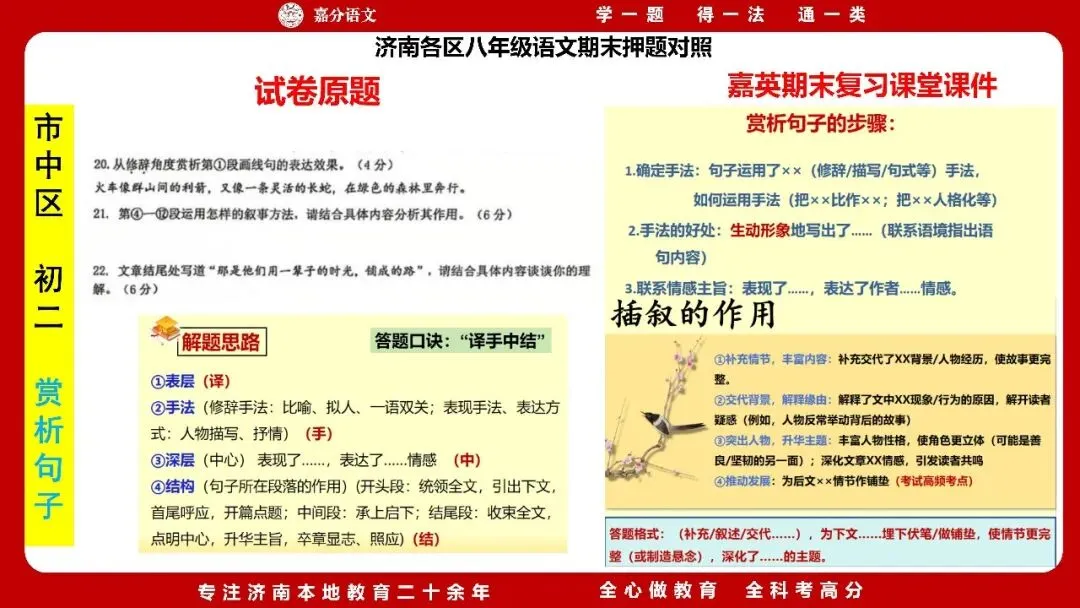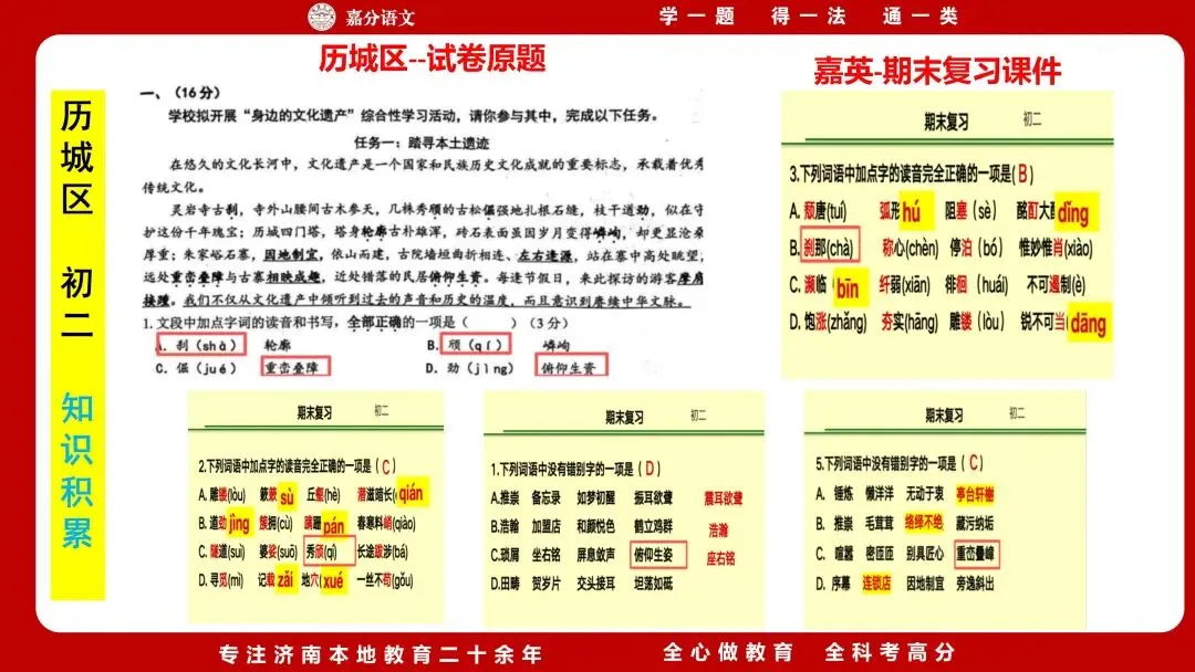 2026语文上学期期末考试落下帷幕,嘉英教育的期末押题又一次精准命中!本次我们聚焦积累与运用和阅读理解两大核心板块,带来超详细的押题对照解析,看看哪些考点被我们精准预判,哪些答题思路能为孩子的期末答卷加分,速来解锁考后复盘干货,为后续学习找准方向~我们始终以“学一题 得一法 通一类”为核心,精讲考点,个性化辅导拆解难点,每一节课堂的知识积累,都是为考场得分做铺垫;每一道课堂例题的讲解,都是对真题考点的精准预判。从业二十余年,荣获新老生家长一致好评!!