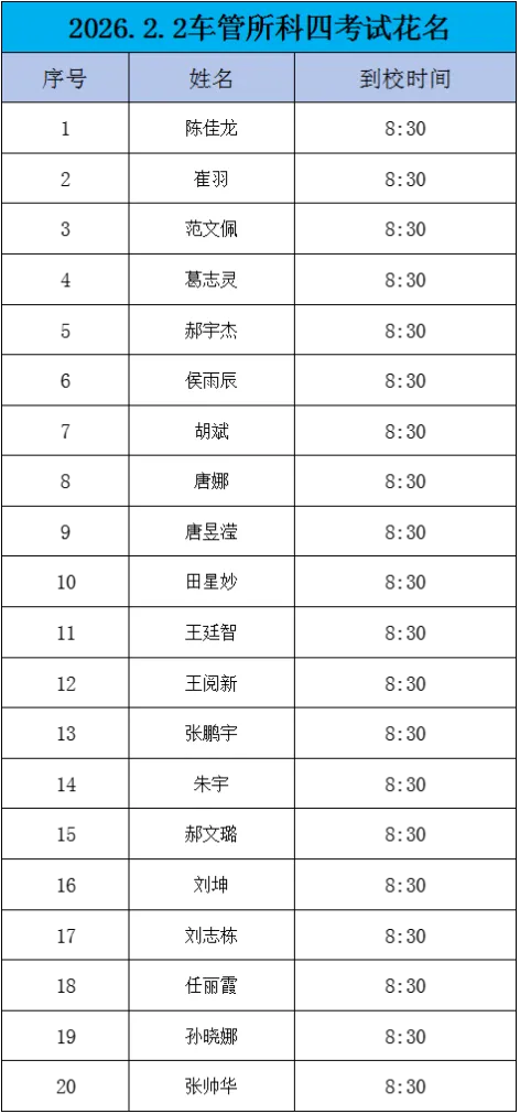 请以下参加明天阳泉理论考试的学员持身份证严格按照驾校公布的时间准时到阳泉车管所理论考场集合,通知如下: