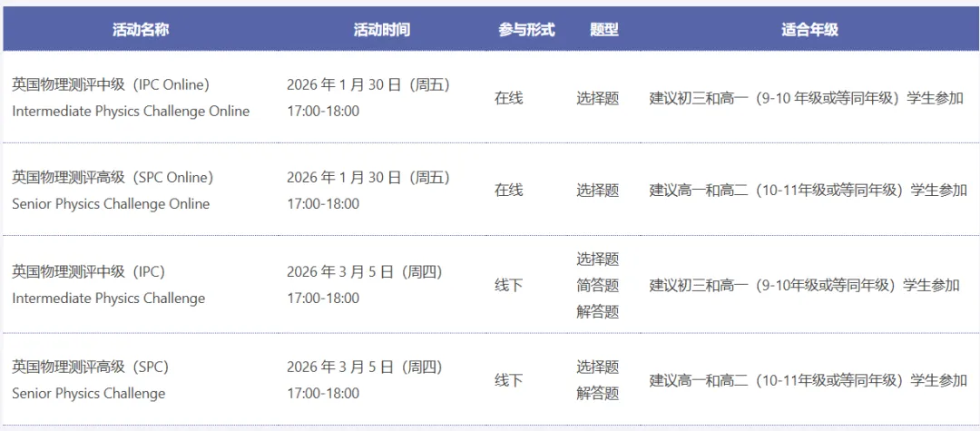 基础挑战类:分为初级(JPC)、中级(IPC)、高级(SPC)物理挑战赛,分别对应9年级、10年级、11年级 / AS物理水平学生,知识点贴合对应学段课程,难度逐步提升。