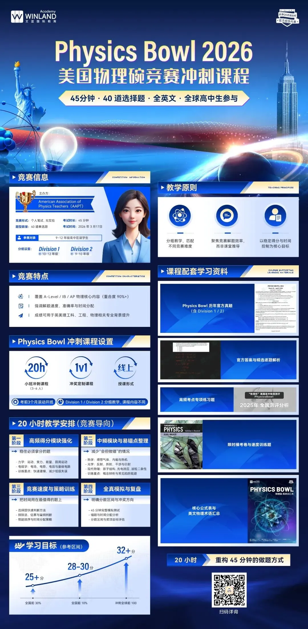 BPhO 作为英国顶尖物理竞赛之一,含金量极高,不仅能为留学申请提供有力的背景支撑,还能充分锻炼和展示学生的物理学科能力与潜力;而物理碗是由美国权威物理教师协会举办的全美极具影响力的高中物理思维挑战赛,同样是备受认可的国际物理赛事。