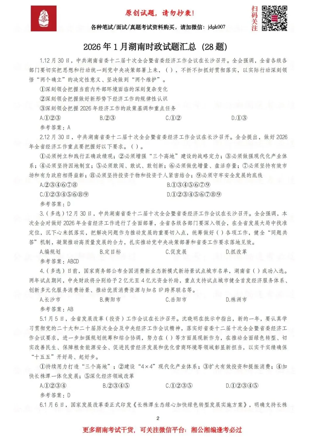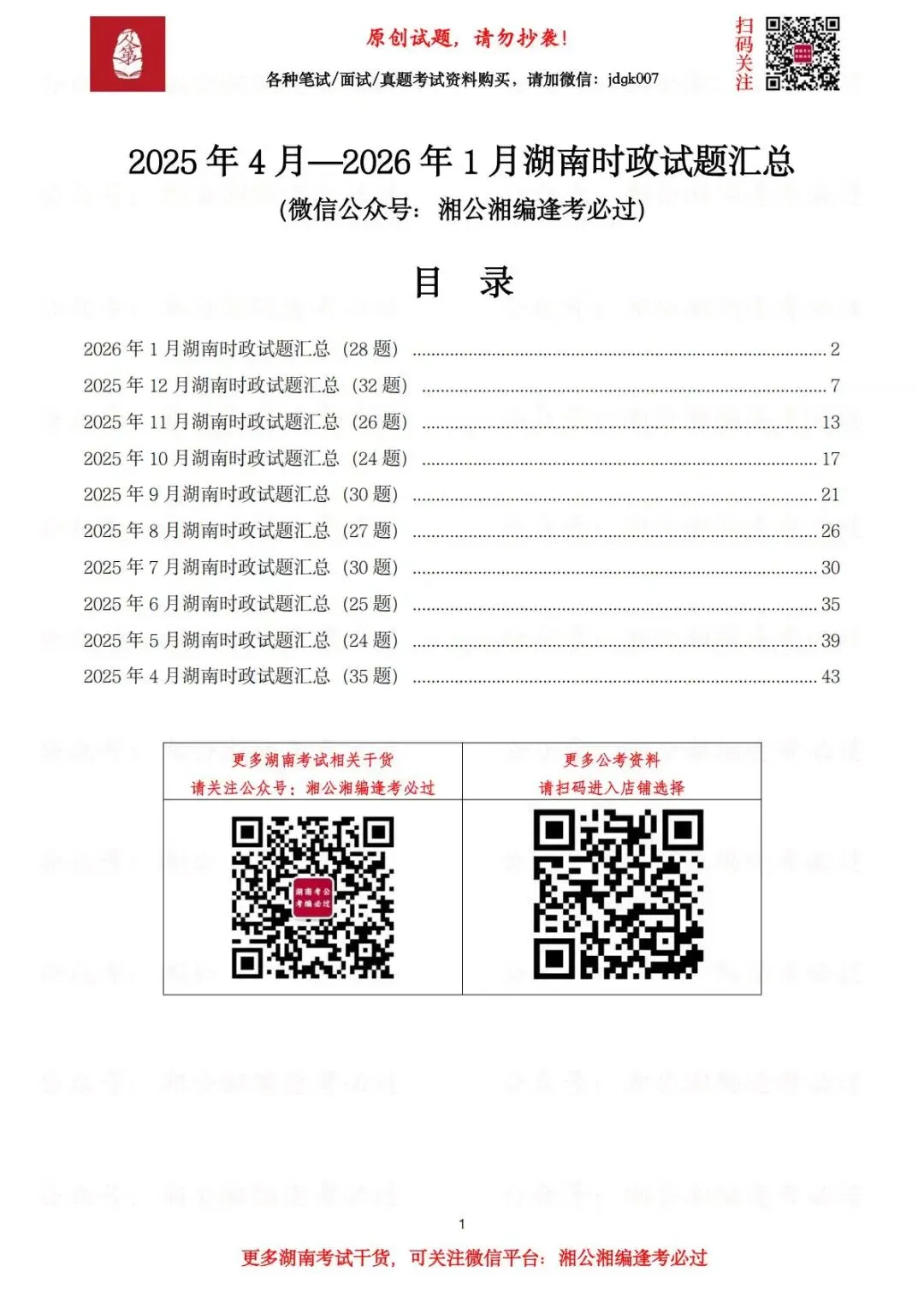 【湖南时政试题】内含2025年4月—2026年1月每月湖南时事政治试题汇总,全部为湖南地方时政试题,共计281题,题后附参考答案,总计47页。
