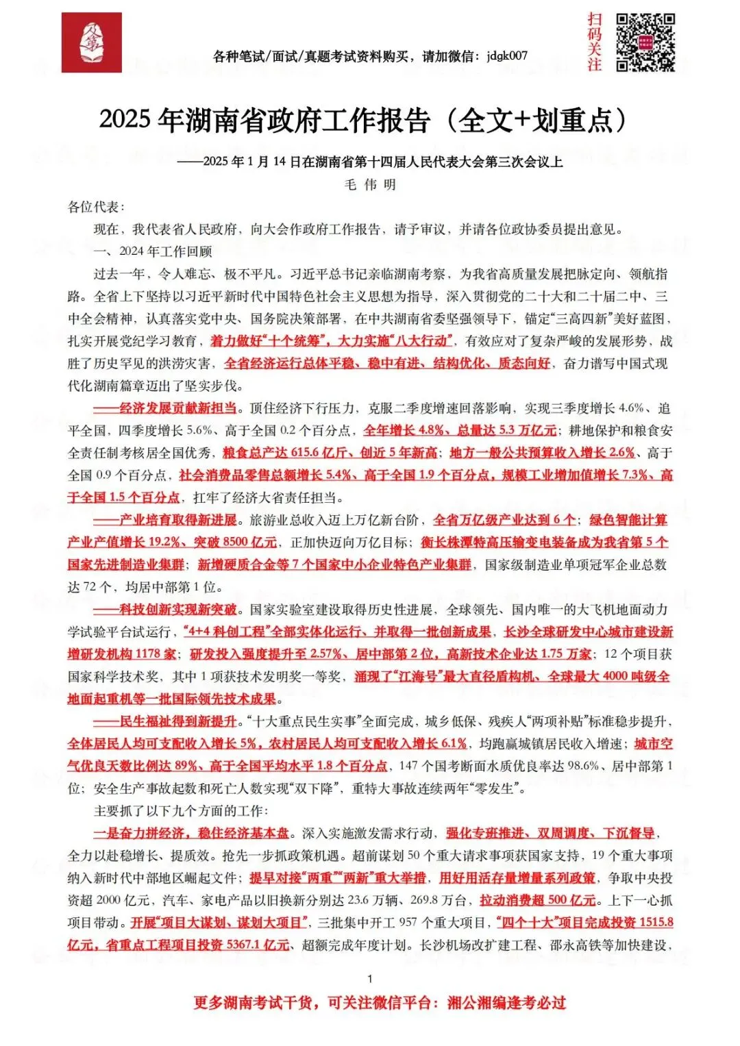 【湖南政府工作报告】2025年湖南省政府工作报告(全文+划重点),总计12页;