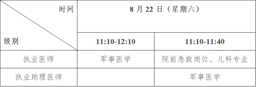 考试实行计算机化考试,军队现役人员、文职人员加试军事医学,院前急救岗位和儿科专业加试相应内容。统一考试时间如下: