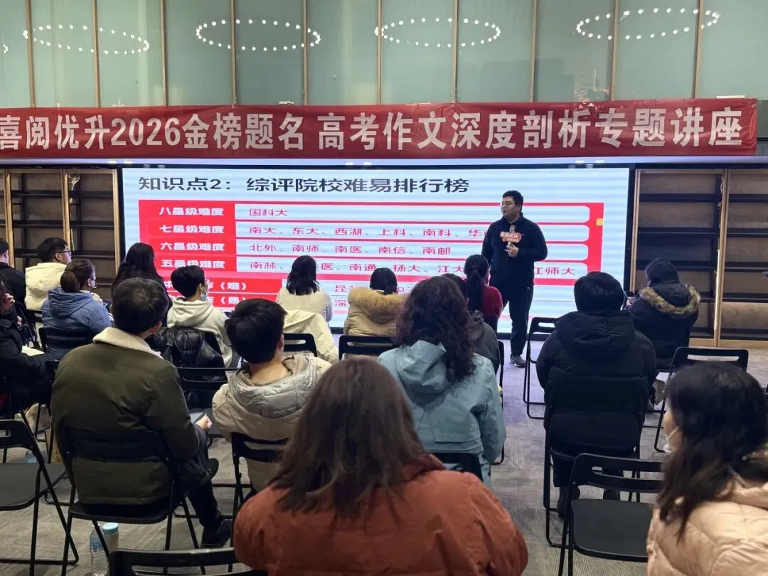 2月1日,由凤凰学生发展研究院——喜阅优升协办的高考备考与升学规划专题讲座顺利举行。 本次活动聚焦"如何突破作文48分"这一核心议题,特邀江苏省教学名师、高考命题研究专家张曙光老师与喜阅优升学术主任杨茂老师联袂开讲,为到场的高三学子及家长们带来了一场兼具深度与实用价值的知识盛宴。