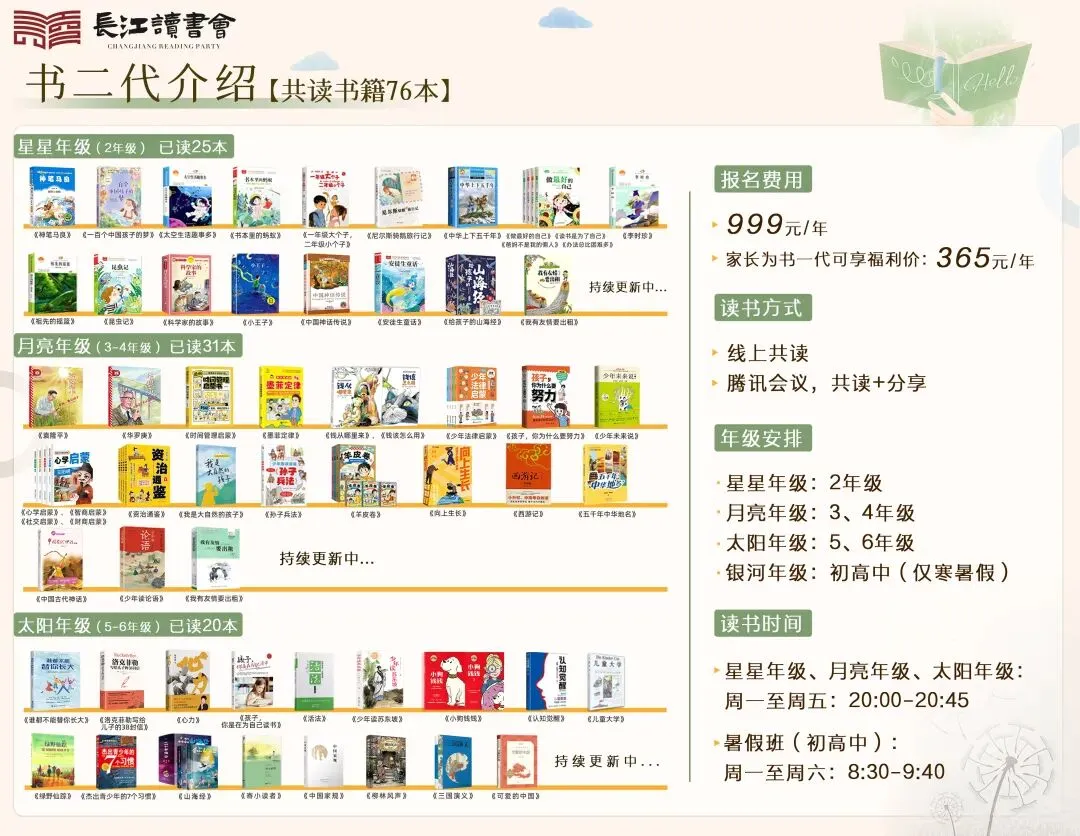 他现在四年级,时间往后也会越来越紧张,我发愿今年带他一起加入读书会,让他成为书二代。