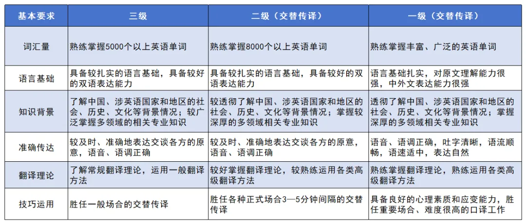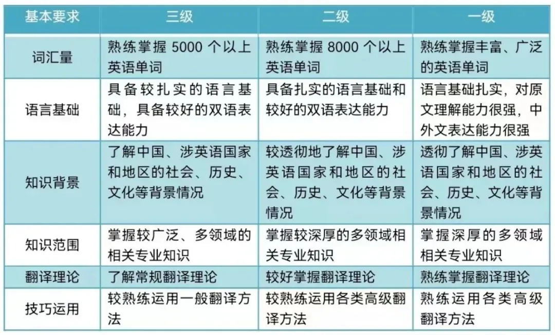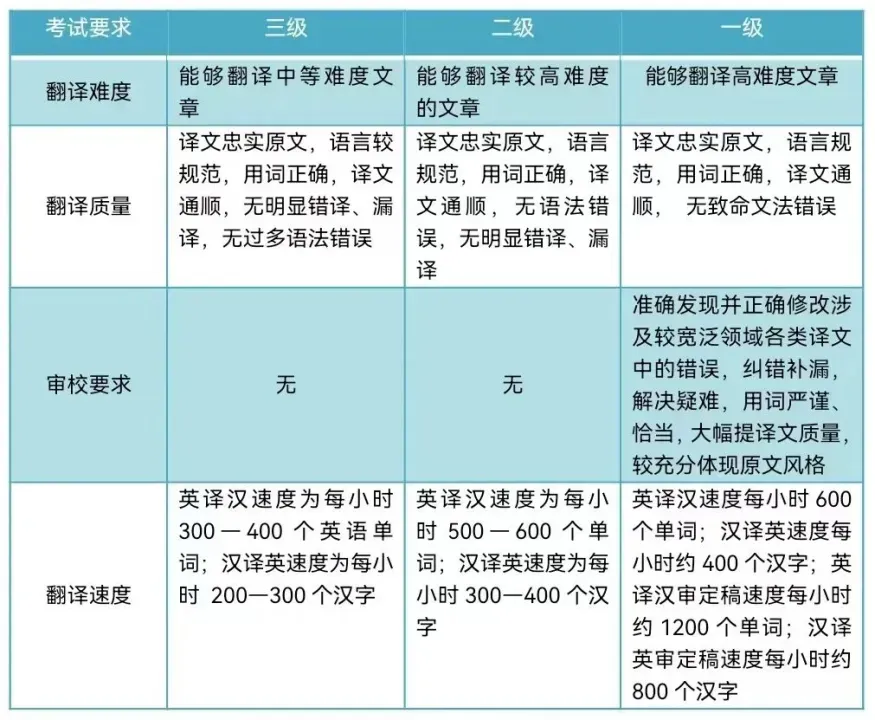 CATTI英语考试分为三个级别,难度由低到高依次是:三级、二级、一级。详情见下图: