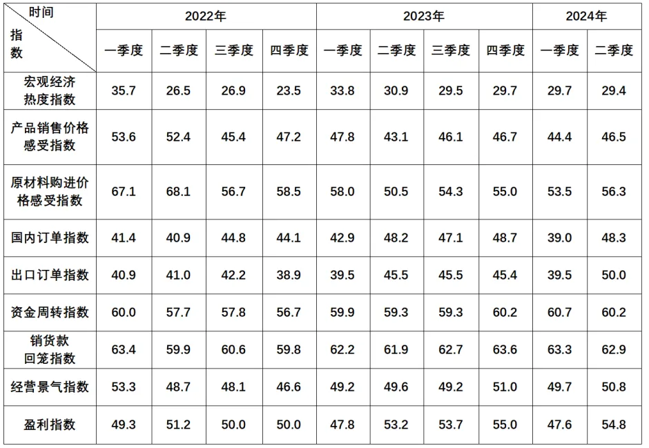 B.2022第二季度~2024年第二季度,原材料购进价格感受指数最大环比增量出现在2023年第三季度