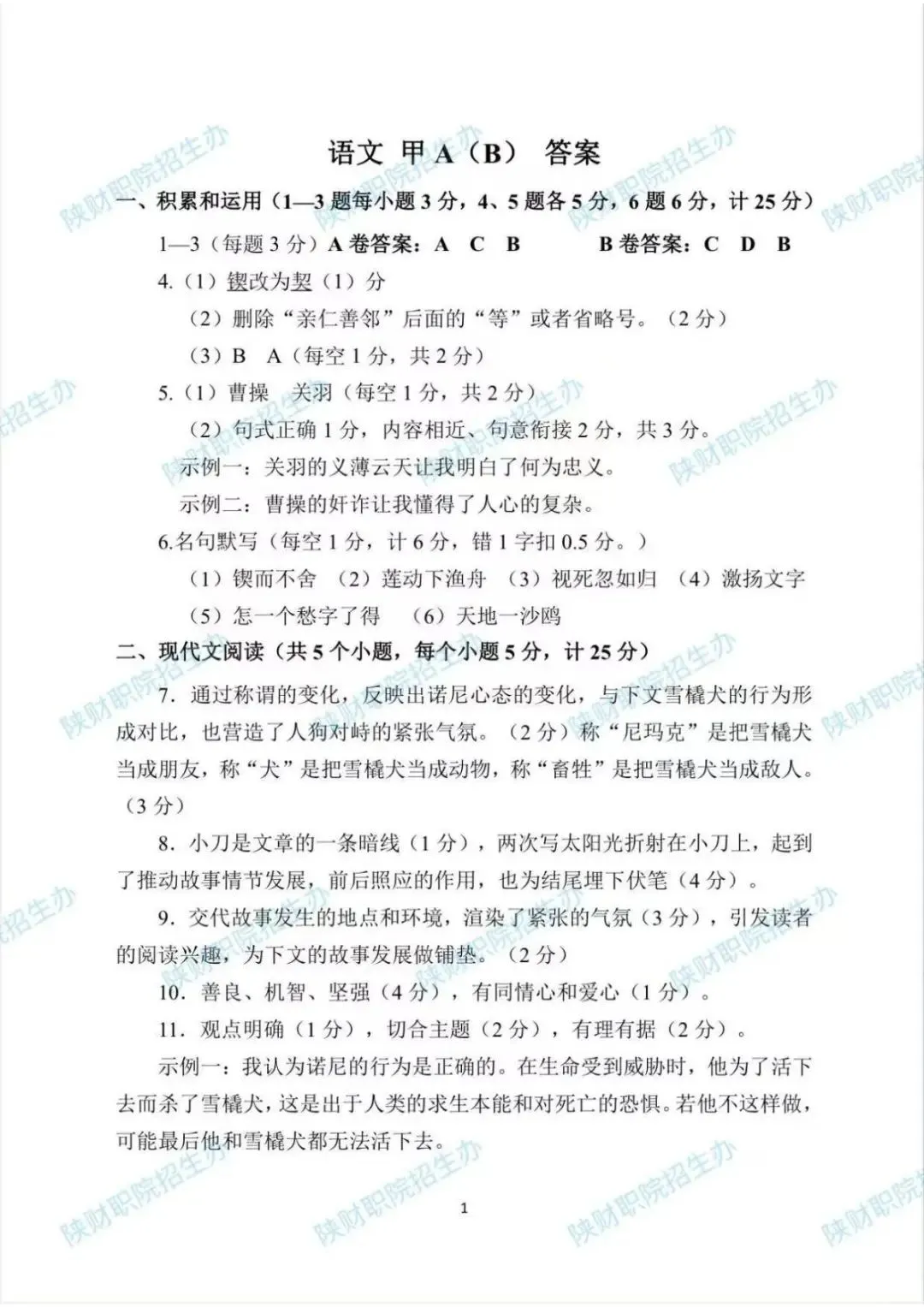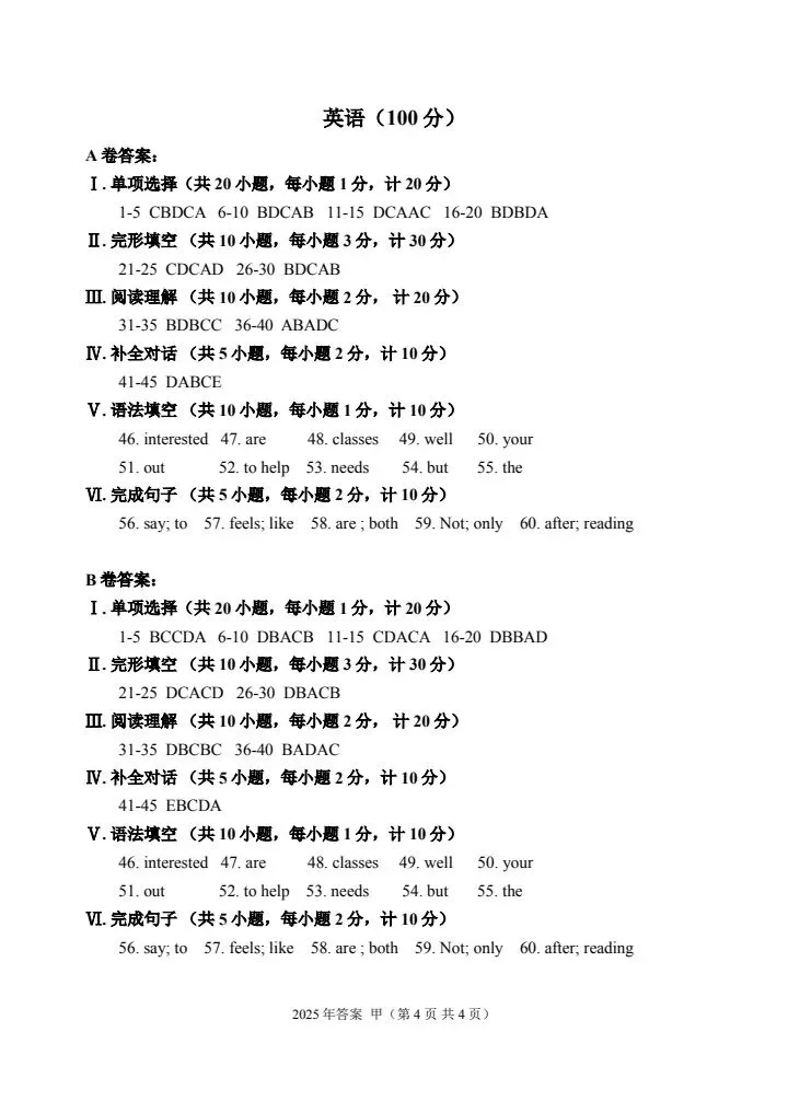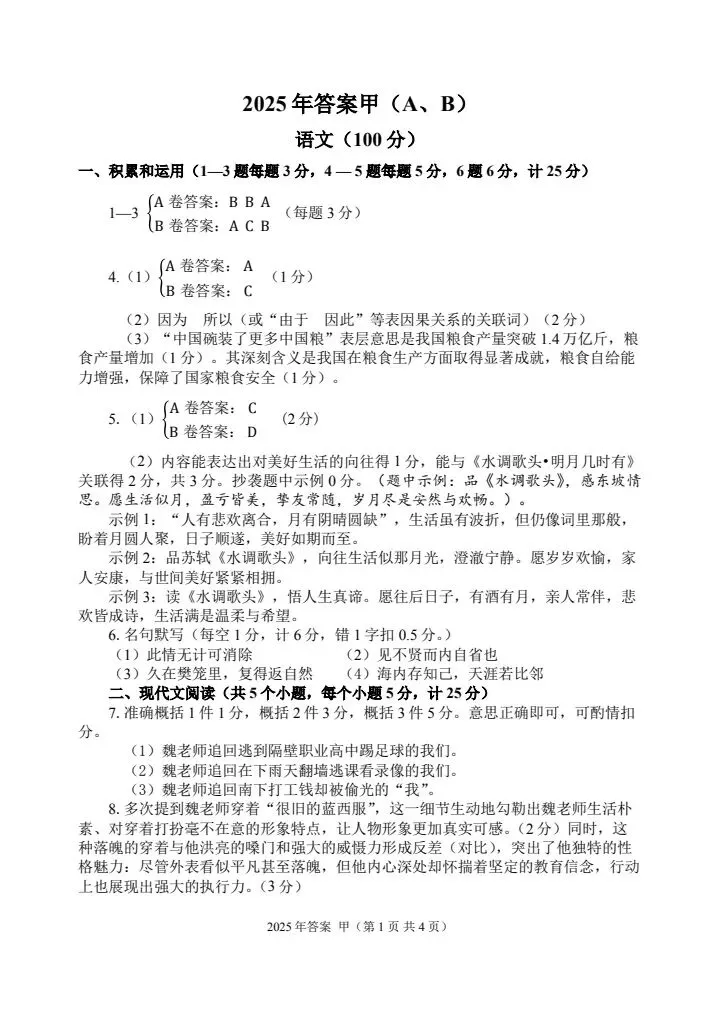 甲卷试题答案