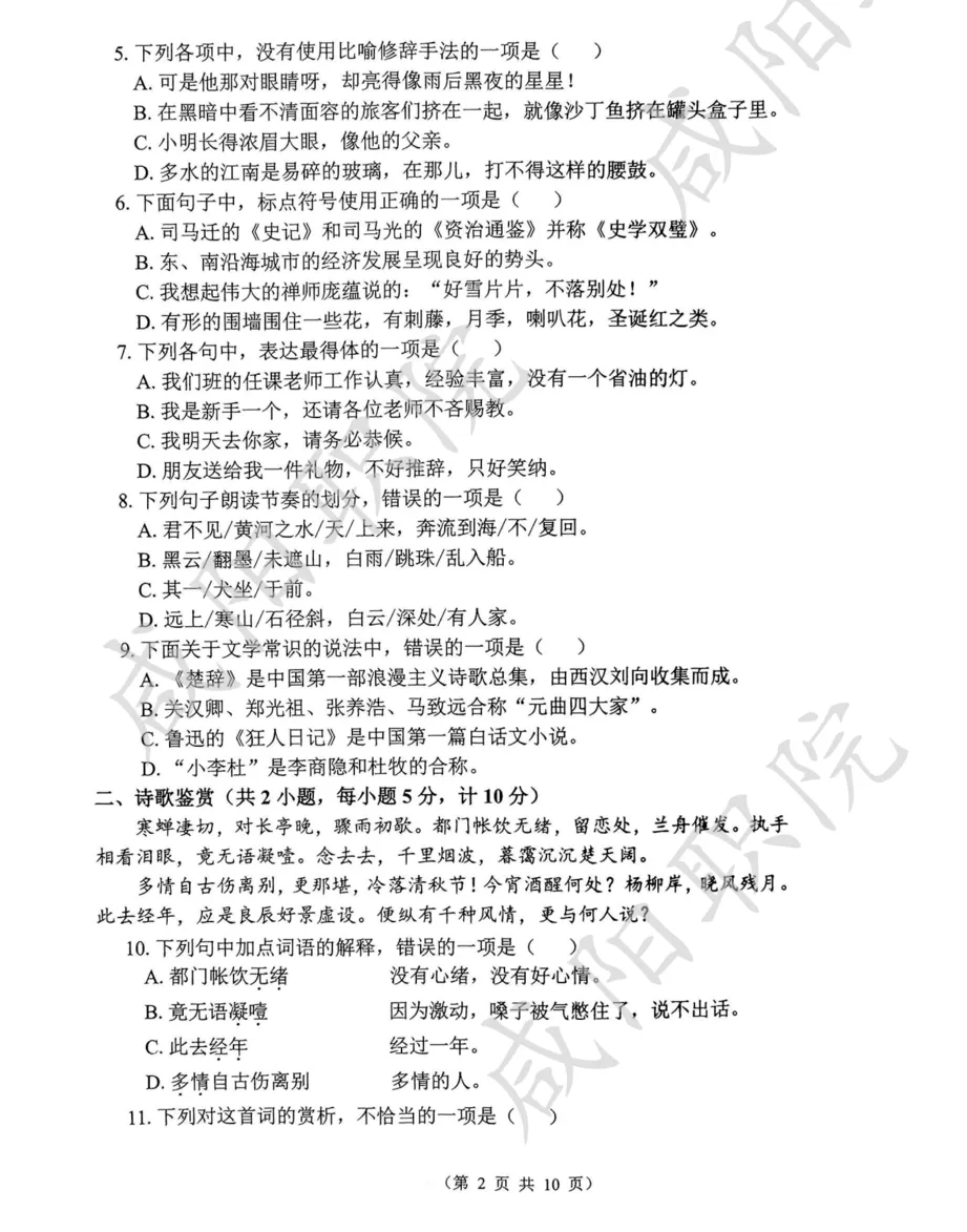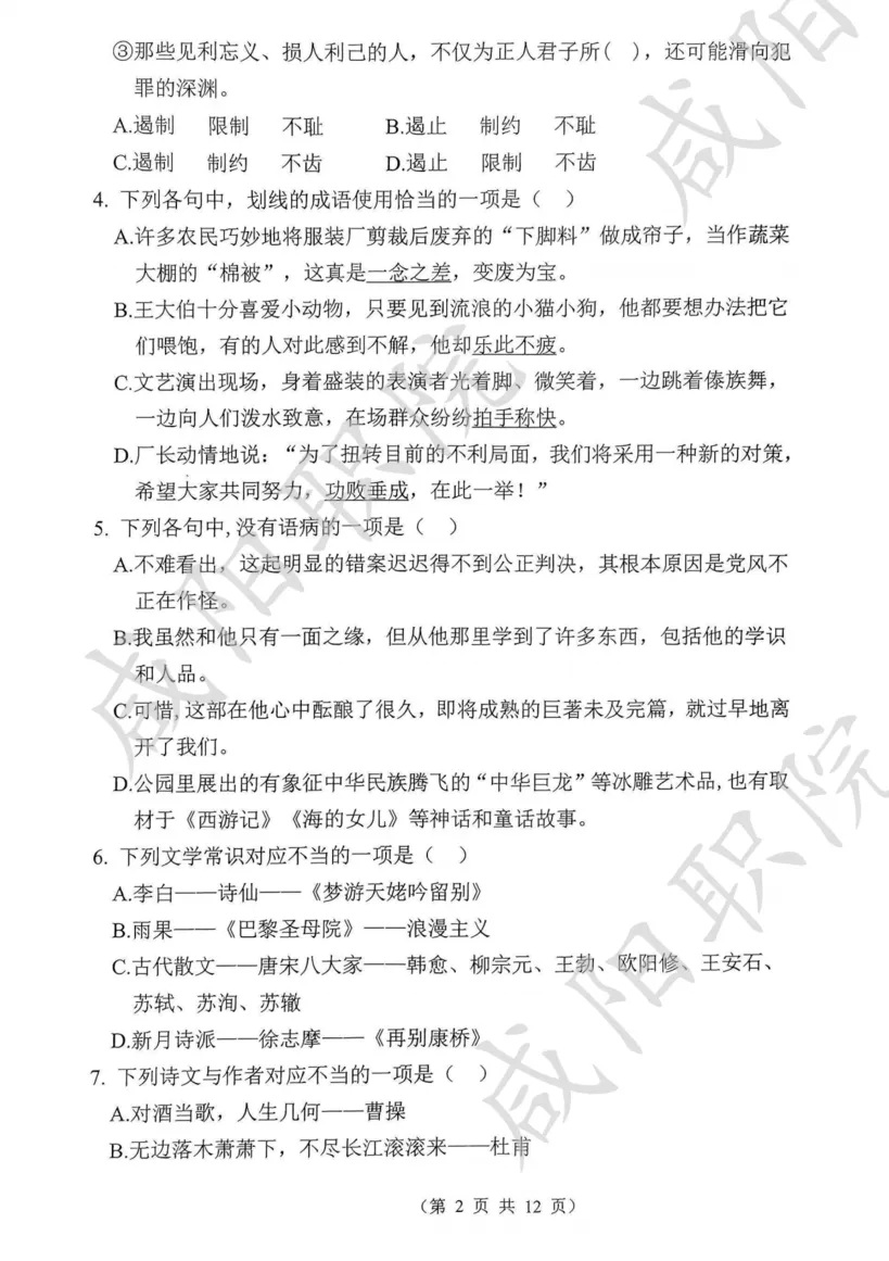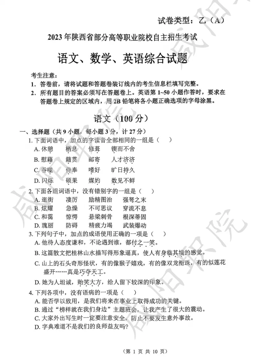 2023年单招试题及参考答案