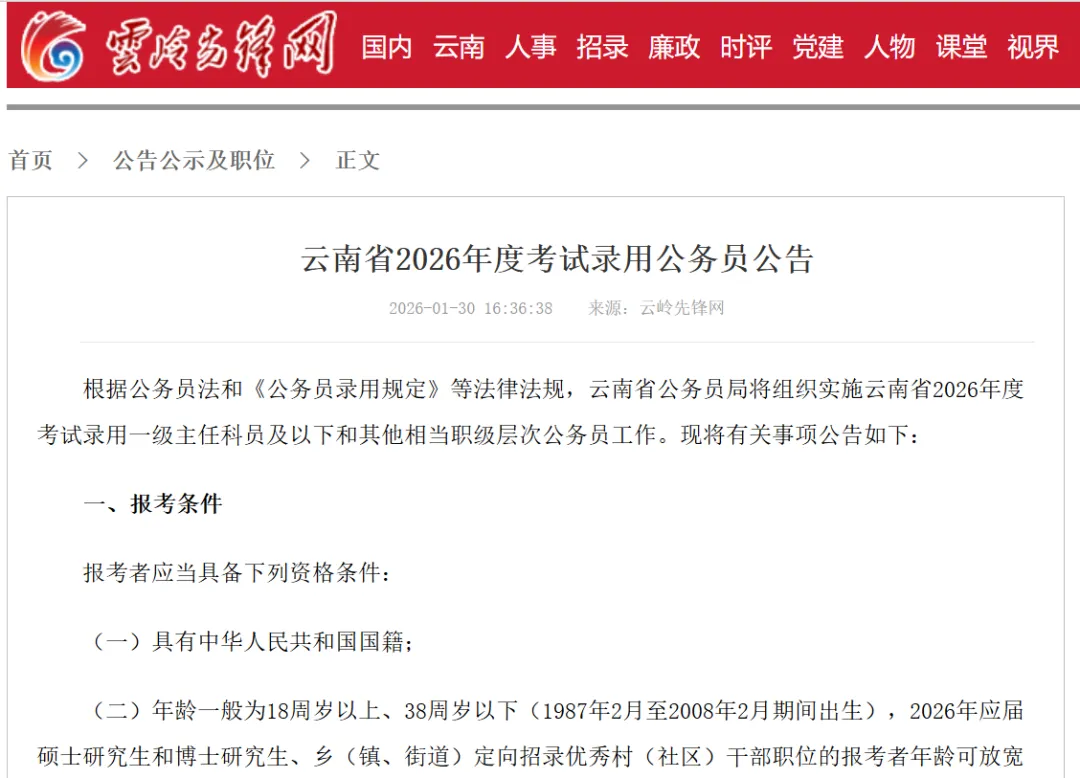 (二)年龄一般为18周岁以上、38周岁以下(1987年2月至2008年2月期间出生),2026年应届硕士研究生和博士研究生、乡(镇、街道)定向招录优秀村(社区)干部职位的报考者年龄可放宽到43周岁以下(1982年2月及以后出生);