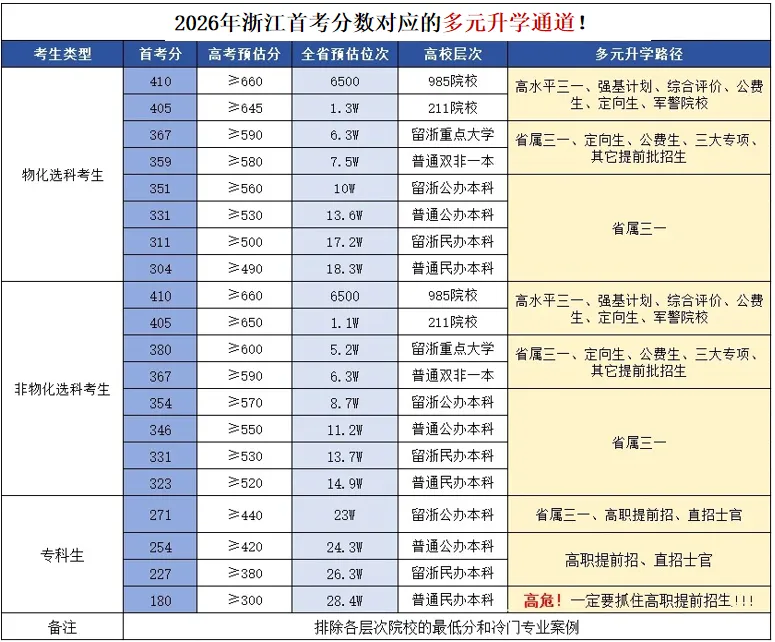 首考落幕,很多同学和家长可能正在为成绩与前景感到焦虑。别担心,在浙江高考的多元升学体系中,“三位一体”正是一条值得牢牢把握的“黄金通道”。它不仅面向拔尖学生,更为广大考生,尤其是预估高考分数在460至630之间的学子,提供了关键性的升学机会(见下表)。