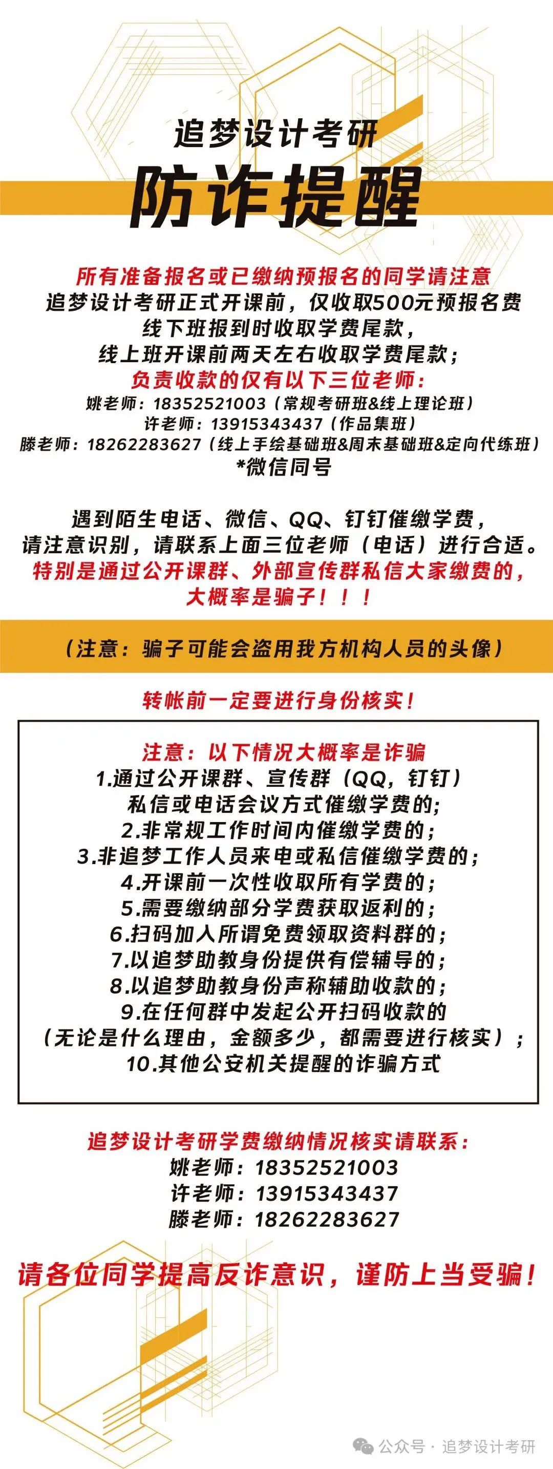追梦设计考研(原“追梦江南设计考研”)成立于2013年,自2014年辅导首届学员以来,现已成功培养九届学员,助力逾千名学员圆梦目标院校。从创立至今,我们一致致力于工业设计(产品设计)、交互设计的专业课程辅导(兼带视觉传达与美术学史论)是华东地区口碑最好的同类机构之一,我们没有花俏的营销文案、没有校园代理、没有网络水军,只有一流稳定的师资、高质量的课程体系、先进的教材,我们是你值得信赖与托付的设计考研辅导品牌。