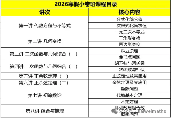 通过暑假和秋季学习,我们已经把代数推理、几何问题及函数问题学习完毕,寒假开篇进行复习,然后把初等数论和组合推理内容讲解一下。同时把中考压轴题的相关内容做一下讲解。课程分为讲义和练习册两部分