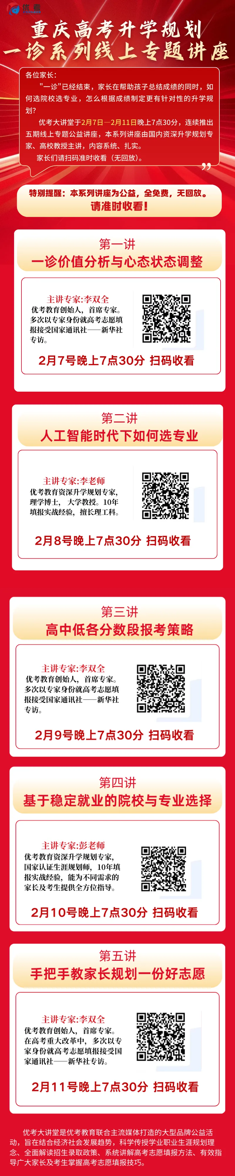 优考大讲堂将于2月7号至11号推出2026高三一诊系列线上专题公益讲座,共5期,每天晚上7点半准时开播,可免费收看。