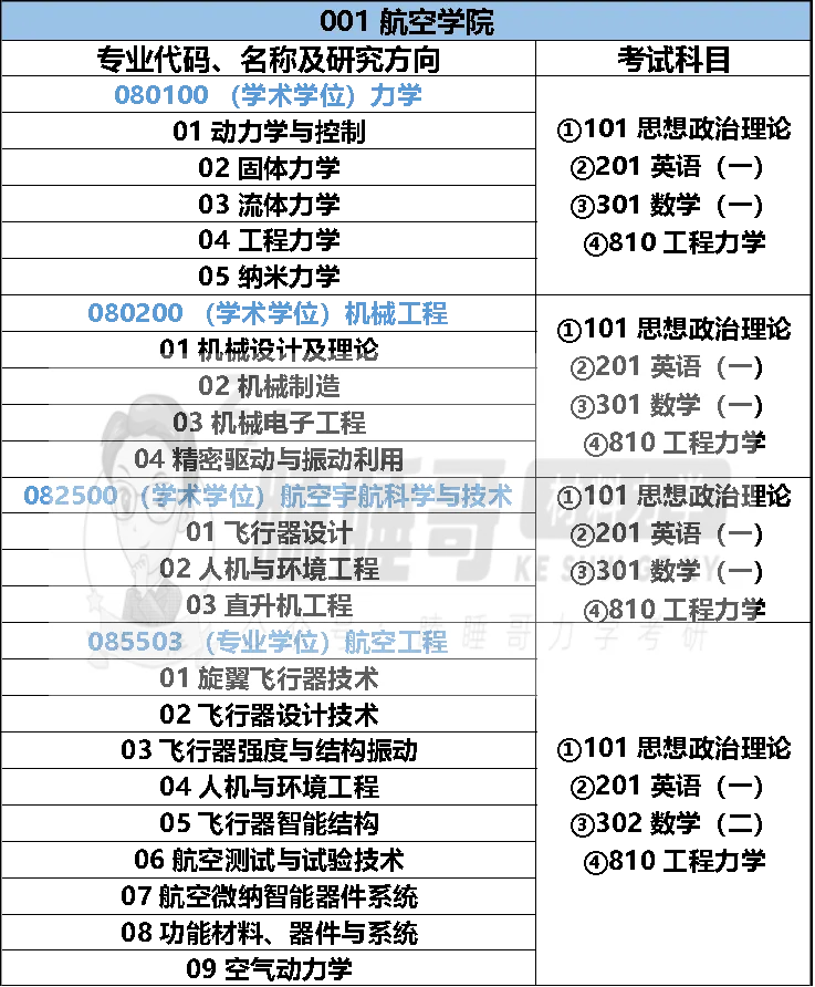 航空学院的学硕力学、机械工程和航空宇航科学与技术以及航空工程专硕(原机械专硕)的初试统考科目为810工程力学,其主要考察的是理论力学(静力学)与材料力学。学硕公共课为思想政治理论、英语一、数学一,专硕公共课为思想政治理论、英语一、数学二,难度略有差距。