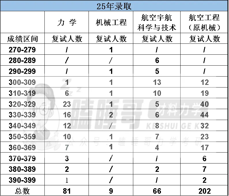 航空工程专硕考生成绩横跨300-399分的区间,分差仅有99分,录取人数却高达202人。其中320-329之间有40人以及330-339之间有44人之多。复试分数线为301,而300-309分数段的录取人数也有9人之多。竞争最为激烈,所以大家进入到复试,不管分高分低都要竭尽所能才能如愿录取。