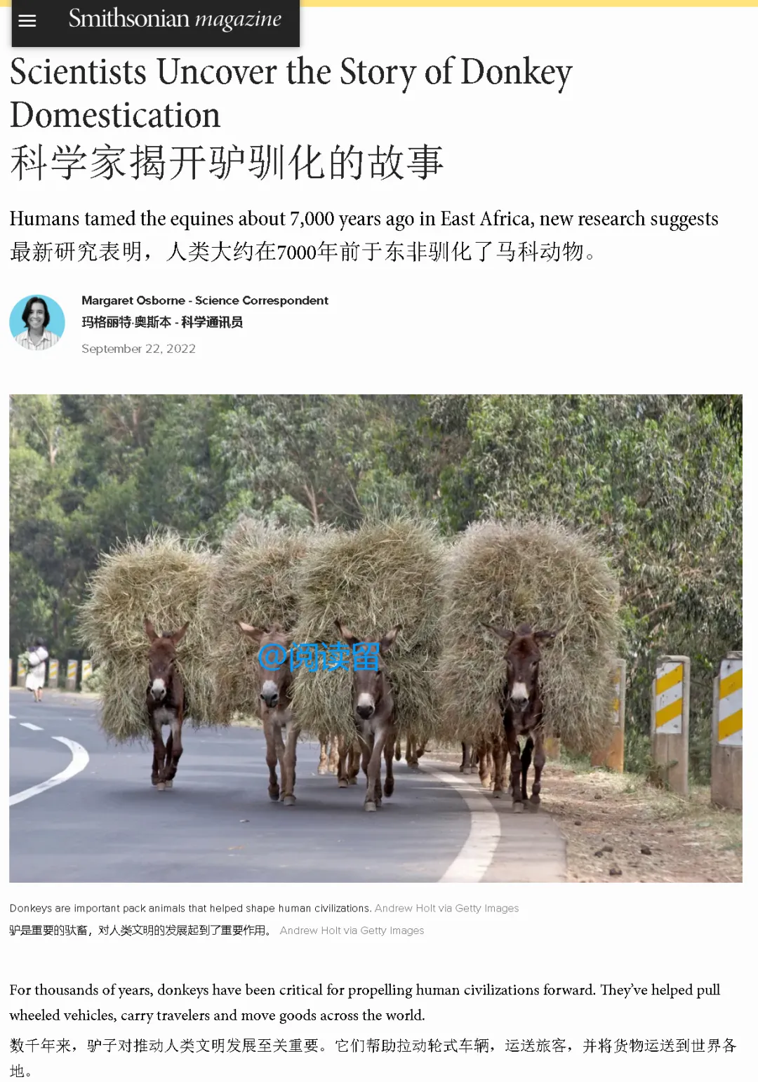 “This is the story of the donkeys… and the detail is amazing,” Greger Larson, an evolutionary biologist at the University of Oxford in England who was not involved with the study, tells Science’s Elizabeth Pennisi. “I’m pleased to see the donkey finally getting his day.” “这是关于驴的故事……细节令人惊叹,”英国牛津大学的进化生物学家格雷格·拉尔森(Greger Larson)告诉《 科学 》 杂志的伊丽莎白·佩尼西(Elizabeth Pennisi),他并未参与这项研究。“我很高兴看到驴终于迎来了属于它的时代。”
