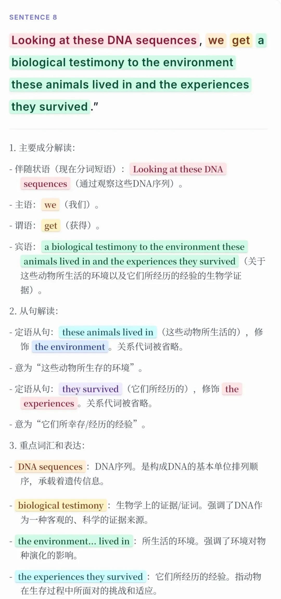 定位句: Looking at these DNA sequences, we get a biological testimony to the environment these animals lived in and the experiences they survived.