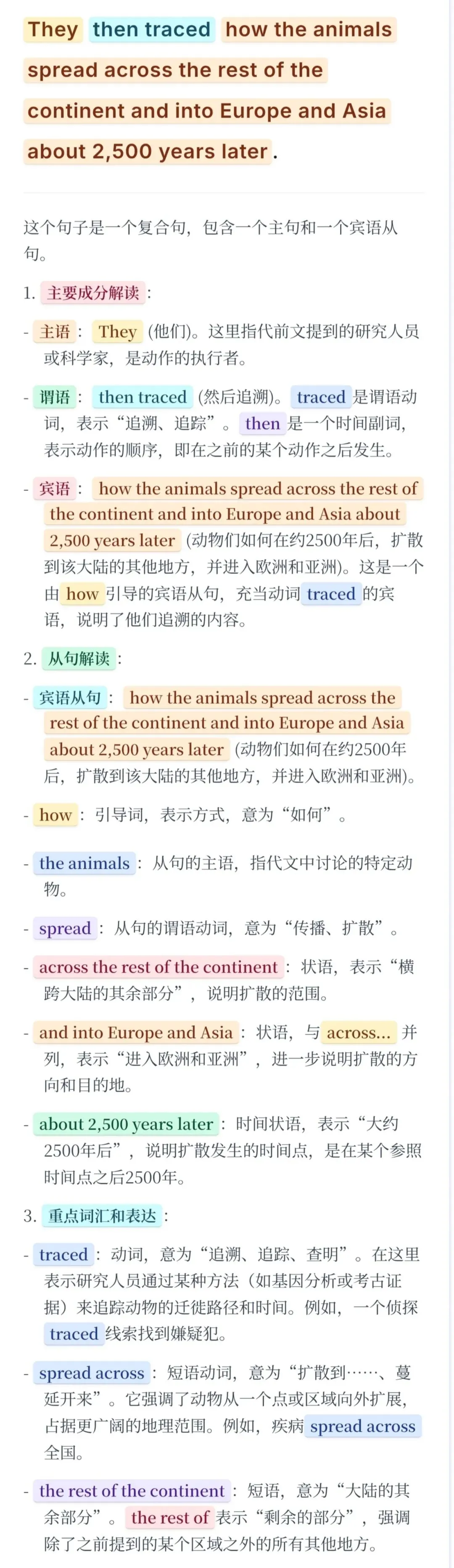 定位句: They then traced how the animals spread across the rest of the continent and into Europe and Asia about 2,500 years later.