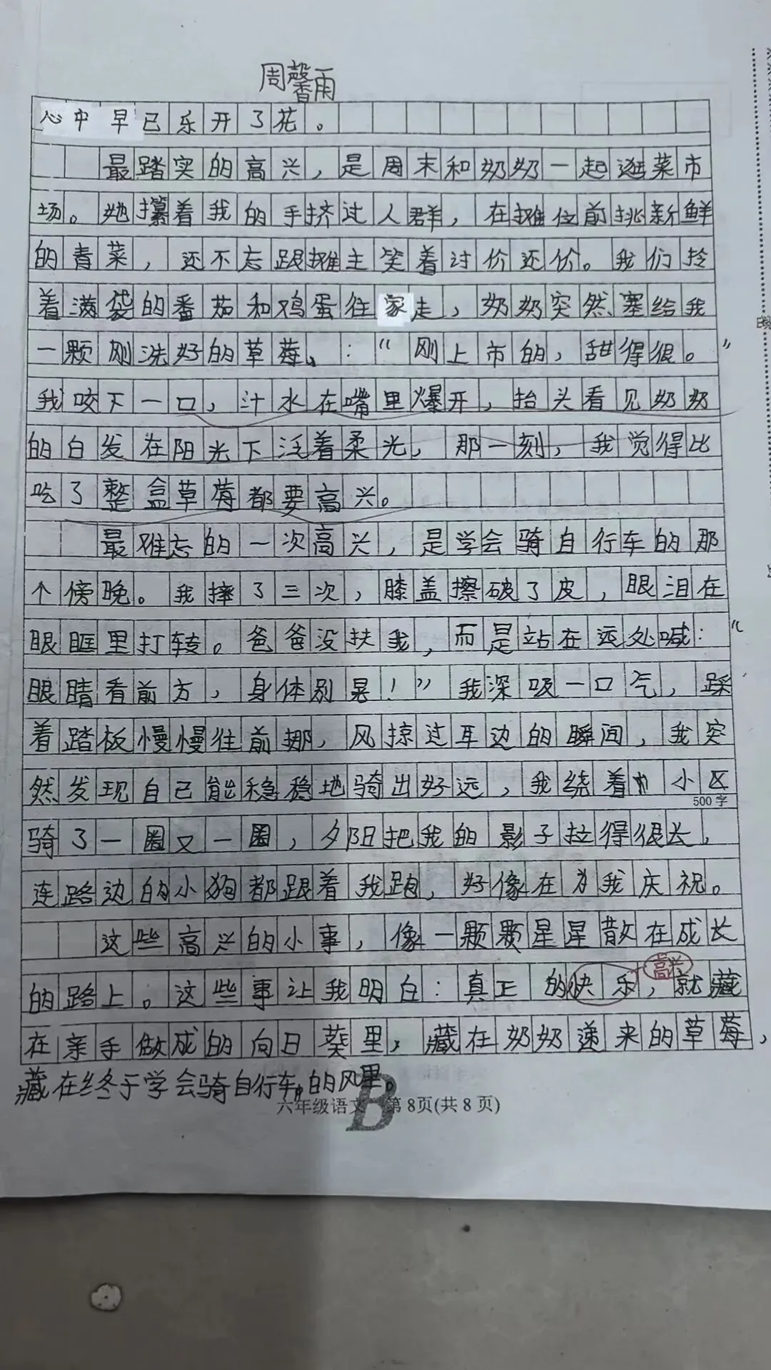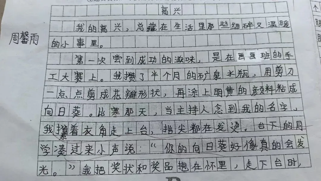 这些高兴的小事,像一颗颗星星散在成长的路上。这些事让我明白,真正的高兴,就藏在亲手做成的向日葵里,含在奶奶递来的草莓里,飘在终于学会骑自行车的风里。
