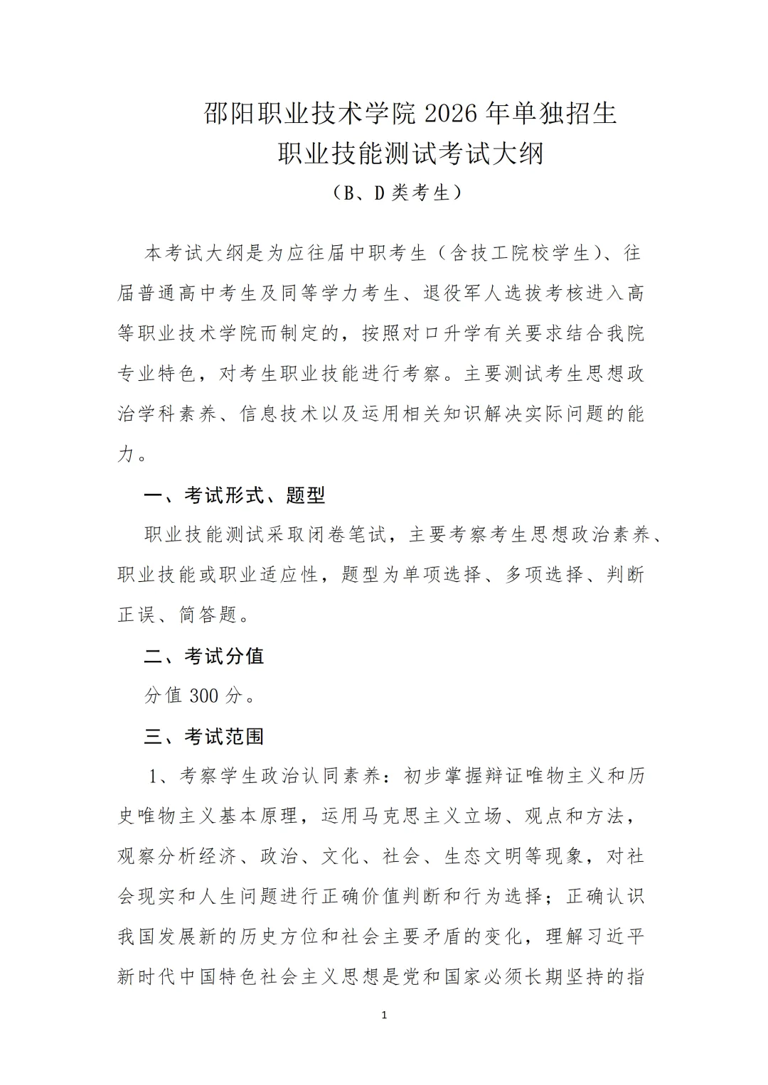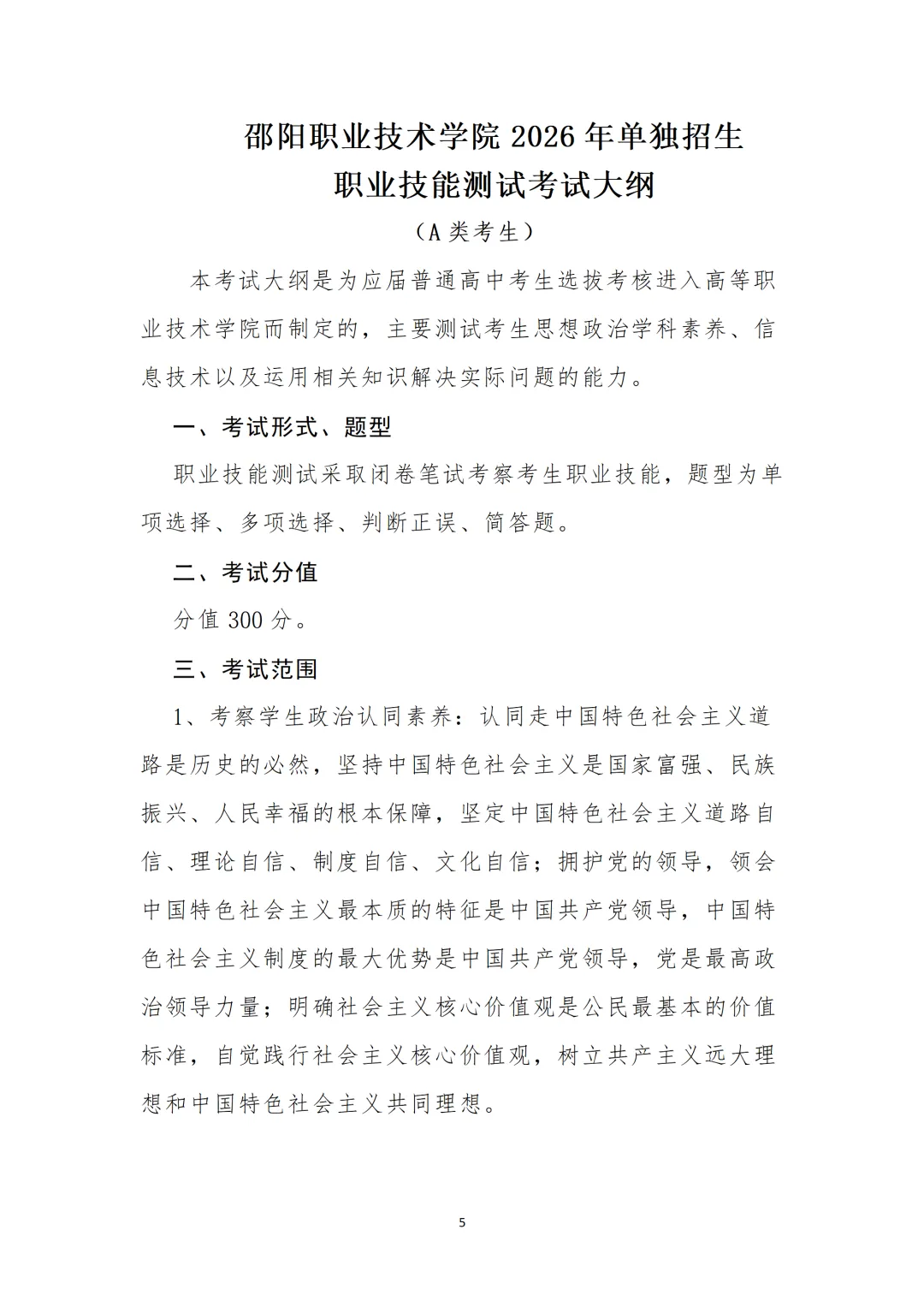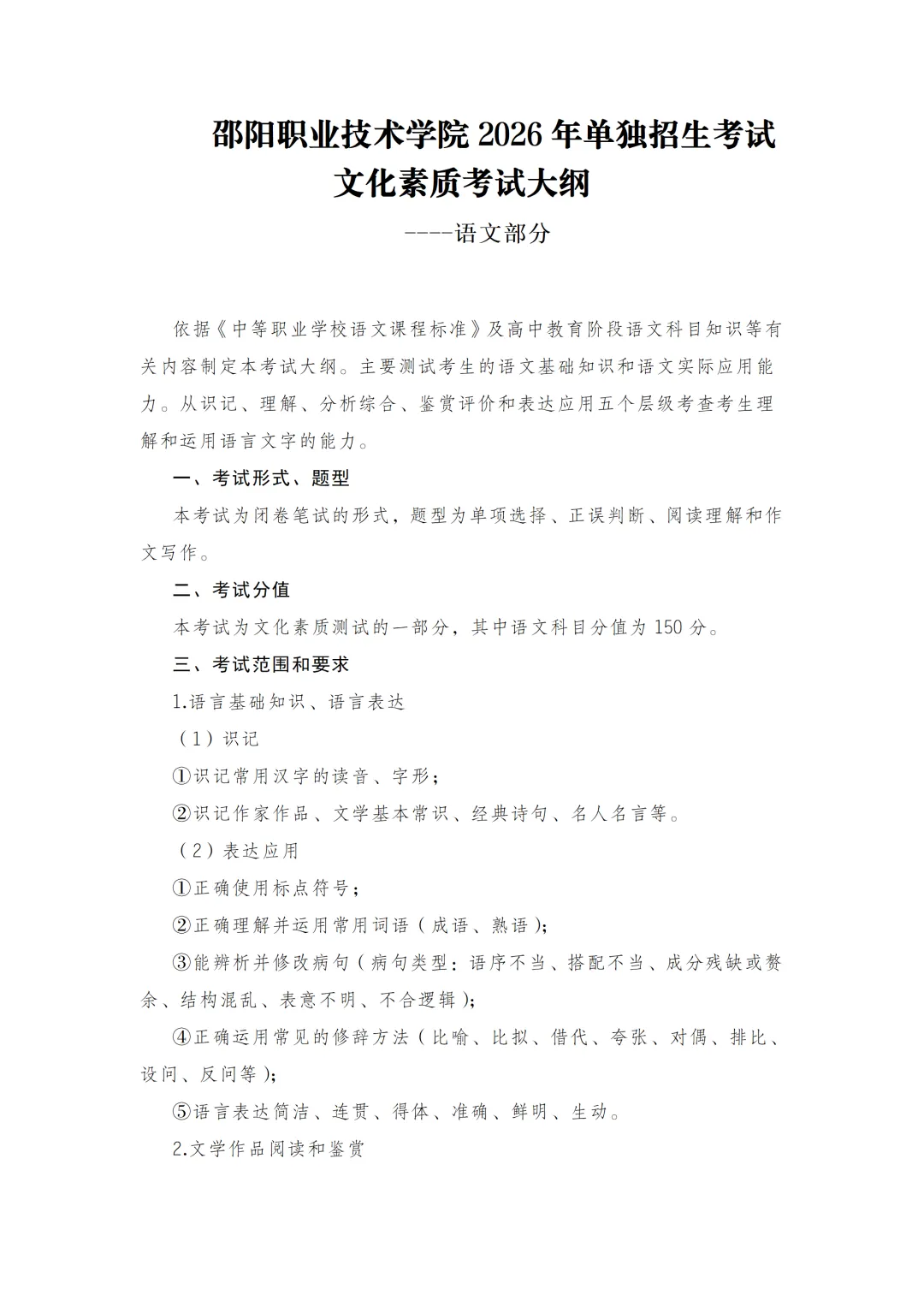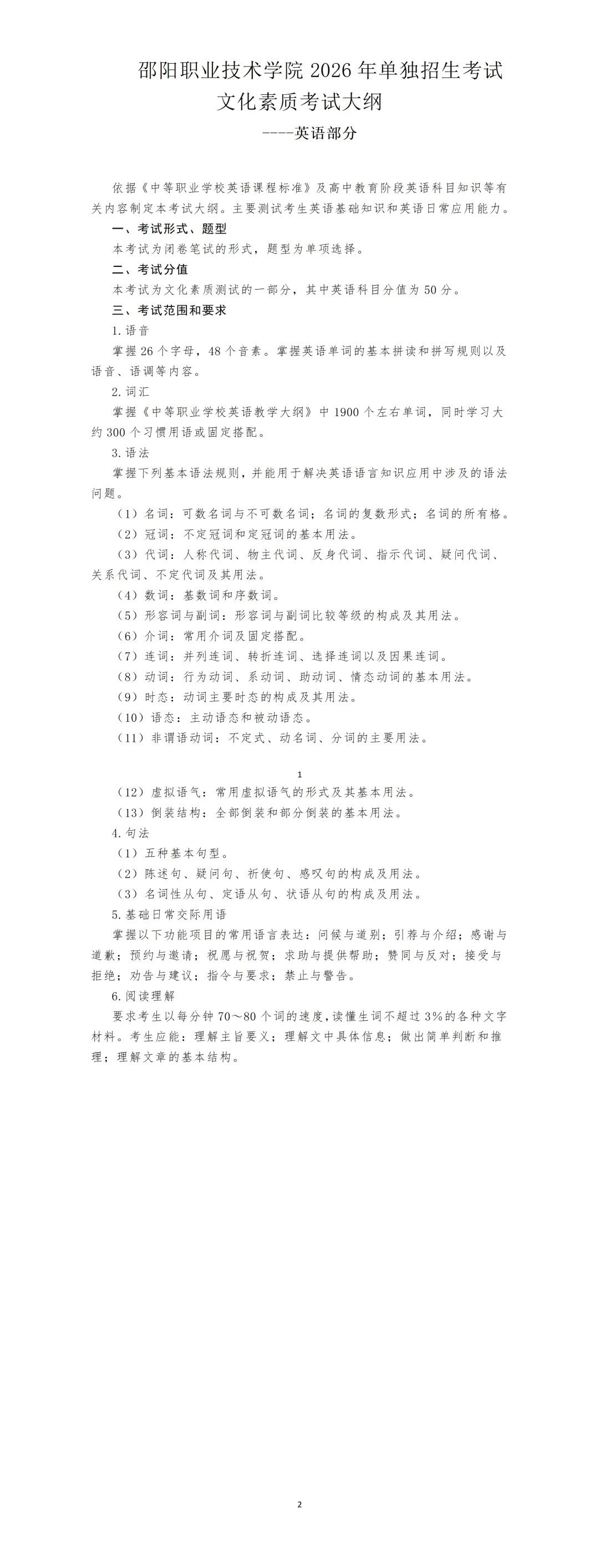 邵阳职业技术学院2026年单招考试大纲