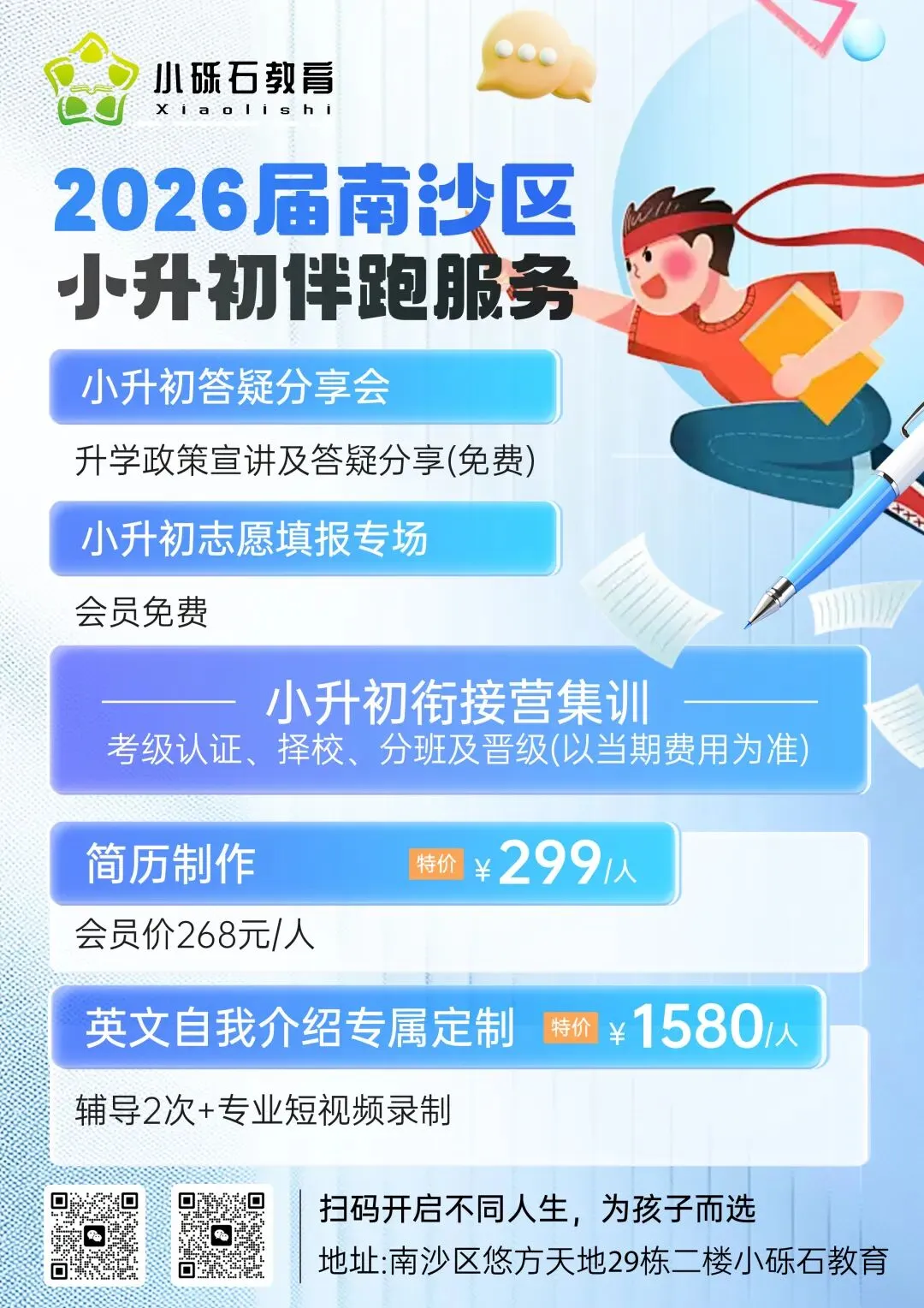 目前5-6年级的升学筹备期已至,为帮助学员提前摸清南沙区升学政策脉络、高效规划备考节奏,我们特别推出2026届南沙区小升初升学伴跑服务(温馨提示:部分服务仅限南沙区在读学员参与)。