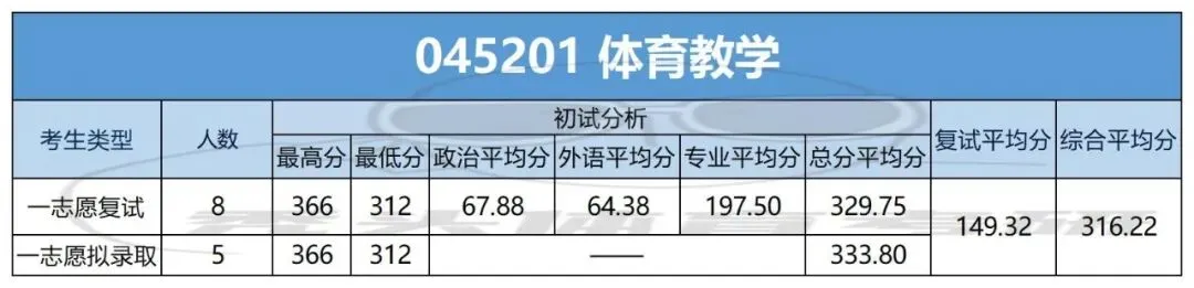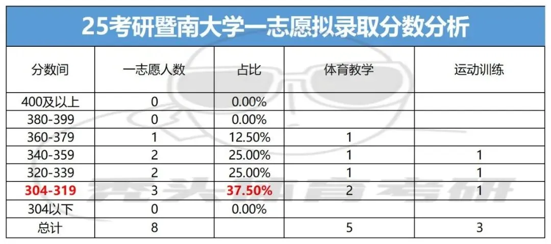 初试最高分是专硕体育教学专业的366分,从进入复试分数区间来看,304-319区间段的人数最多,占复试总人数的37.5%。
