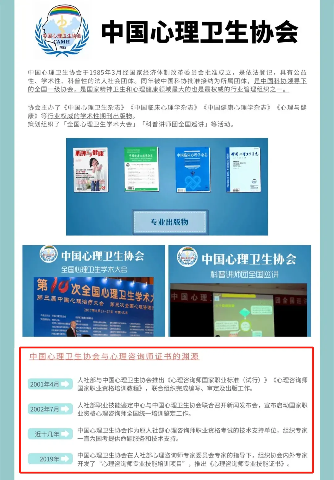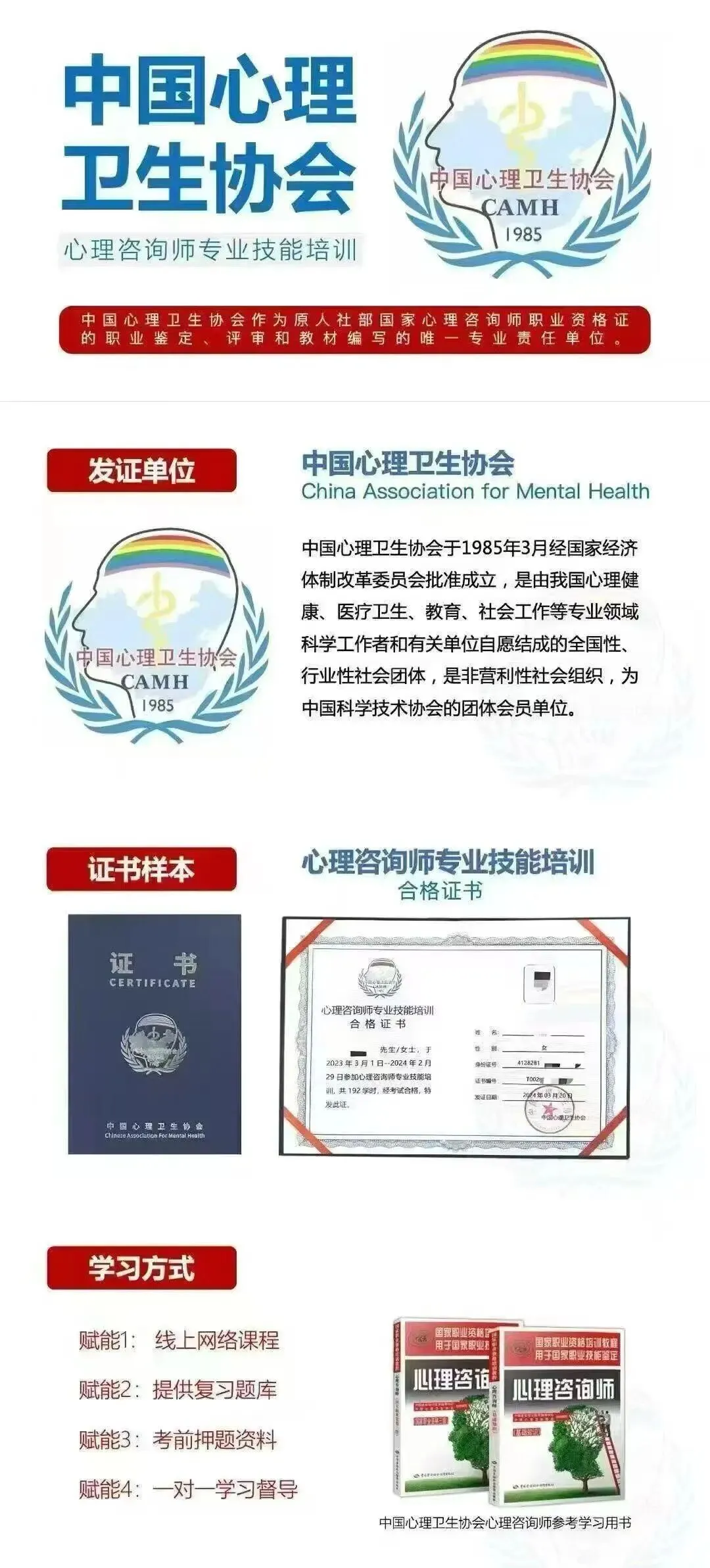 中国心理卫生协会是国家一级行业协,国家精神卫生和心理健康领域最大的也是最权威的行业管理组织,同时也是原人社部心理咨询师职业资格考试的技术支持单位,相关培训教材的编写单位。